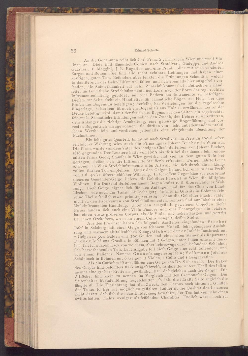 Aus den Provinzen haben fich folgende Ausfteller eingefunden: Stecher Jofef in Salzburg mit einer Geige von fchönem Modell, fehr gelungener Ausführung und warmem altitalienifchen Klang; Gfchwendtner Jofef in Innsbruck mit 2 Geigen zu 500 Gulden und 300 Gulden und einer alten Stainer als Reparatur; Diener Jofef aus Graslitz in Böhmen mit 3 Geigen, unter ihnen eine mit dunklem, faft fchwarzem Lack von weichem, aber keineswegs durch befondere Schönheit fich hervorhebenden Ton. Laut Angabe foll diefe Geige eine echt italienifche, und von einem Italiener, Namens Guanefa angefertigt fein; Volkmann Jofef aus Schönbach in Böhmen mit 6 Geigen, 2 Violen, I Cello und 1 Geigenkaften.