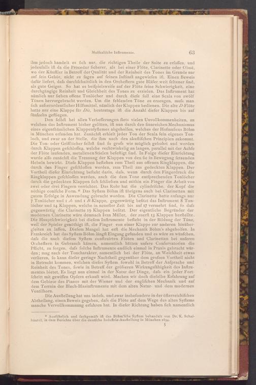 Den felbft bei allen Verbefferungen ftets vielen Unvollkommenheiten, an welchen das Inftrument bisher gelitten, ift nun durch den finnreichen Mechanismus eines eigenthümlichen Klappenfyftemes abgeholfen, welches der Hofmuficus Böhm in München erfunden hat. Zunächft erhielt jeder Ton der Scala fein eigenes Tonloch, und zwar an der Stelle, die ihm nach den akuftifchen Principien zukommt. Die Ton- oder Grifflöcher felbft find fo grofs wie möglich gebohrt und werden durch Klappen gefchloffen, welche rechtwinkelig an langen, parallel mit der Achfe der Flöte laufenden, metallenen Stielen befeftigt find. In Folge diefer Einrichtung wurde alfo zunächft die Trennung der Klappen von den fie in Bewegung fetzenden Hebeln bewirkt. Diefe Klappen beftehen zum Theil aus offenen Ringklappen, die durch den Finger gefchloffen werden, zum Theil aus gedeckten Klappen. Der Vortheil diefer Einrichtung befteht darin, dafs, wenn durch den Fingerdruck die Ringklappen gefchloffen werden, auch die dem Tone entſprechenden Tonlöcher durch die gedeckten Klappen fich fchliefsen und mithin ein Finger die Arbeit von zwei oder drei Fingern verrichtet. Das Rohr hat die cylindrifche, der Kopf die nöthige conifche Form.* Das Syftem Böhm ift übrigens auch bei Clarinetten mit gutem Erfolge in Anwendung gebracht worden. Die Clarinette hatte anfangs nur 7 Tonlöcher und 1 A- und 1 B- Klappe, gegenwärtig befitzt das Inftrument 8 Tonlöcher und 14 Klappen, welche in neuefter Zeit bis auf 17 vermehrt find, fo dafs gegenwärtig die Clarinette 19 Klappen befitzt. Der eigentliche Begründer der modernen Clarinette wäre demnach Ivan Müller, der zuerft 13 Klappen herftellte. Die Hauptfchwierigkeit bei diefem Inftrumente befteht in der Bildung der Töne, weil der Spieler genöthigt ist, die Finger von einer Klappe zur anderen hinübergleiten zu laffen. Diefem Mangel hat erft die Mechanik Böhm's abgeholfen. In Frankreich hat das Syftem Böhm längft Eingang gefunden und es wäre zu wünſchen, dafs die nach diefem Syftem conftruirten Flöten und Clarinetten bei unferen Oicheftern in Gebrauch kämen, namentlich hätten unfere Confervatorien die Pflicht, zu forgen, dafs folche Inftrumente endlich einmal in Praxis gebracht würden; mag auch der Toncharakter, namentlich bei der Flöte, an Weichheit etwas verlieren, fo kann diefer geringe Nachtheil gegenüber dem grofsen Vortheil nicht in Betracht kommen, welchen diefes Syftem fowohl in Betreff der Anfprache und Reinheit des Tones, fowie in Betreff der gröfseren Wirkungsfähigkeit des Inftrumentes bietet. Es liegt nun einmal in der Natur der Dinge, dafs ein jeder Fortfchritt mit gewiffen Opfern erkauft wird. Machen wir doch diefelbe Erfahrung auf dem Gebiete des Pianos mit der Wiener und der englifchen Mechanik und auf dem Terrain der Blech- Blasinftrumente mit dem alten Natur- und dem modernen Ventilhorn.