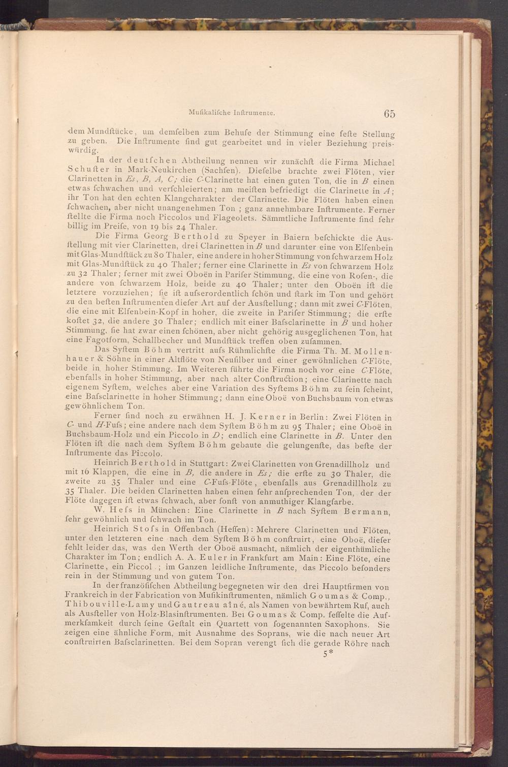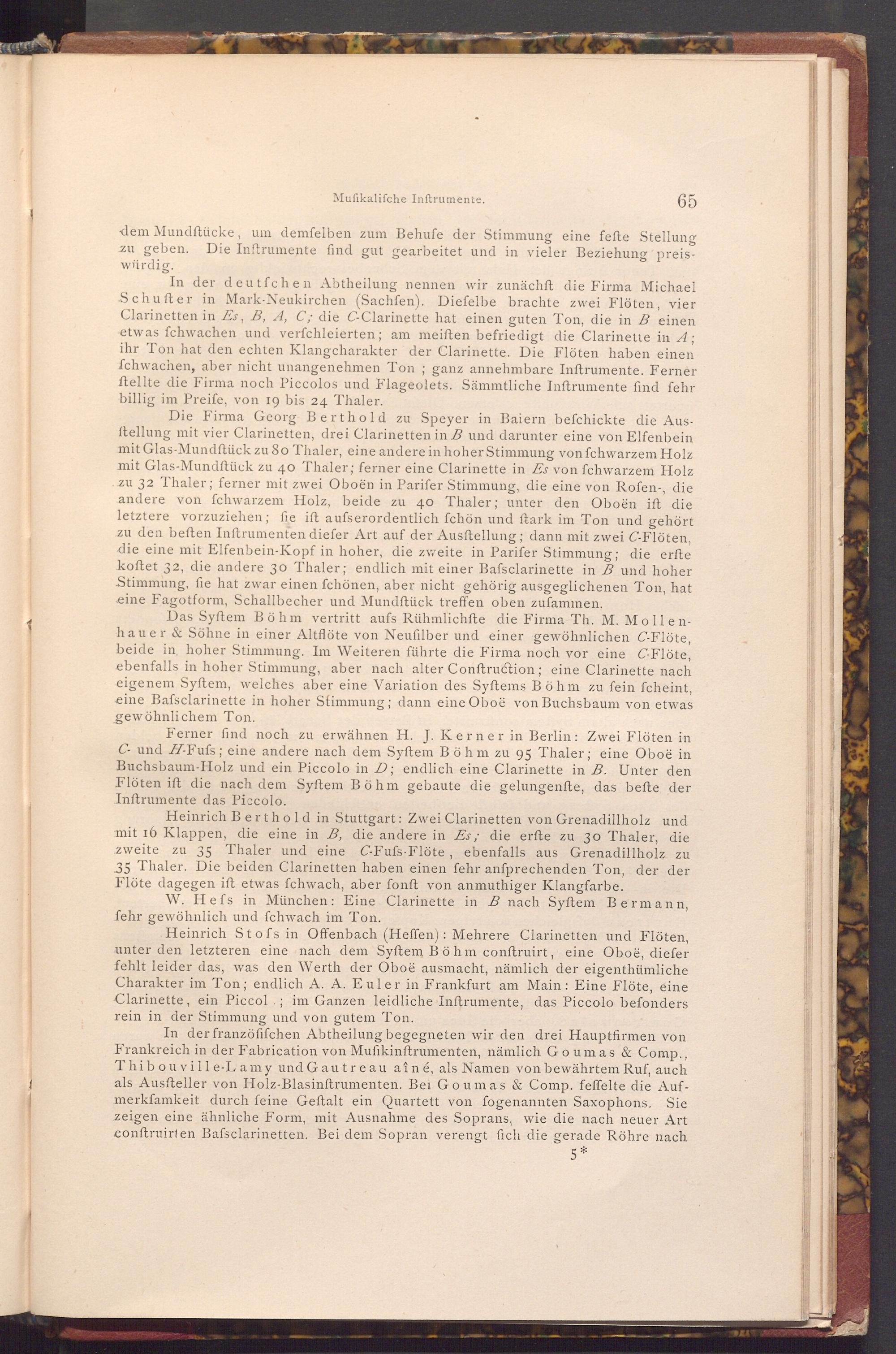 Ferner find noch zu erwähnen H. J. Kerner in Berlin: Zwei Flöten in C- und H- Fufs; eine andere nach dem Syftem Böhm zu 95 Thaler; eine Oboë in Buchsbaum- Holz und ein Piccolo in D; endlich eine Clarinette in B. Unter den Flöten ift die nach dem Syftem Böhm gebaute die gelungenfte, das befte der Inftrumente das Piccolo.