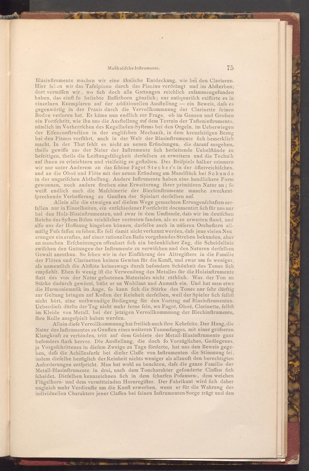 Allein alle die etwaigen auf diefem Wege gemachten Errungenfchaften zerfallen nur in Einzelheiten, ein entfchiedener Fortfchritt documentirt fich für uns nur bei den Holz- Blasinftrumenten, und zwar in dem Umftande, dafs wir im deutfchen Reiche das Syftem Böhm reichlicher vertreten fanden, als es zu erwarten ftand, und alfo uns der Hoffnung hingeben können, dasfelbe auch in unferen Orcheſtern allmälig Fufs faffen zu fehen. Es foll damit nicht verkannt werden, dafs jene vielen Neu erungen ein ernftes, auf einer rationellen Bafis vorgehendes Streben bekunden, aber an manchen Erfcheinungen offenbart fich ein bedenklicher Zug, die Scheidelinie zwifchen den Gattungen der Inftrumente zu verwifchen und den Naturen derfelben Gewalt anzuthun. So, fehen wir in der Einführung des Altregifters in die Familie der Flöten und Clarinetten keinen Gewinn für die Kunft, und zwar um fo weniger, als namentlich die Altflöte keineswegs durch befondere Schönheit des Tones fich empfiehlt. Eben fo wenig ift die Verwendung des Metalles für die Holzinftrumente ftatt des von der Natur gebotenen Materiales nicht räthlich. Was der Ton an Stärke dadurch gewinnt, büfst er an Wohllaut und Anmuth ein. Und hat man etwa die Harmoniemufik im Auge, fo kann fich die Stärke des Tones nur fehr dürftig zur Geltung bringen auf Koften der Reinheit derfelben, weil der Spieler fich felbft nicht hört, eine nothwendige Bedingung für den Vortrag auf Blasinftrumenten. Ueberdiefs dürfte der Tag nicht mehr ferne fein, wo Fagot, Oboë, Clarinette, felbft im Kleide von Metall, bei der jetzigen Vervollkommnung der Blechinftrumente, ihre Rolle ausgefpielt haben werden.