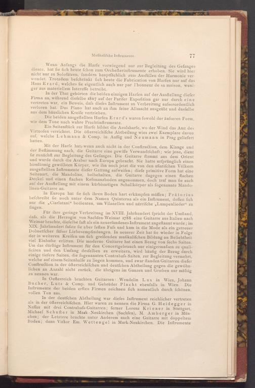 In Oefterreich brachten Guitarren: Wendelin Lux in Wien, Johann Bucher, Lutz& Comp. und Gebrüder Placht ebenfalls in Wien. Die Inftrumente der beiden erften Firmen zeichnen fich namentlich durch fchönen, vollen Ton aus.