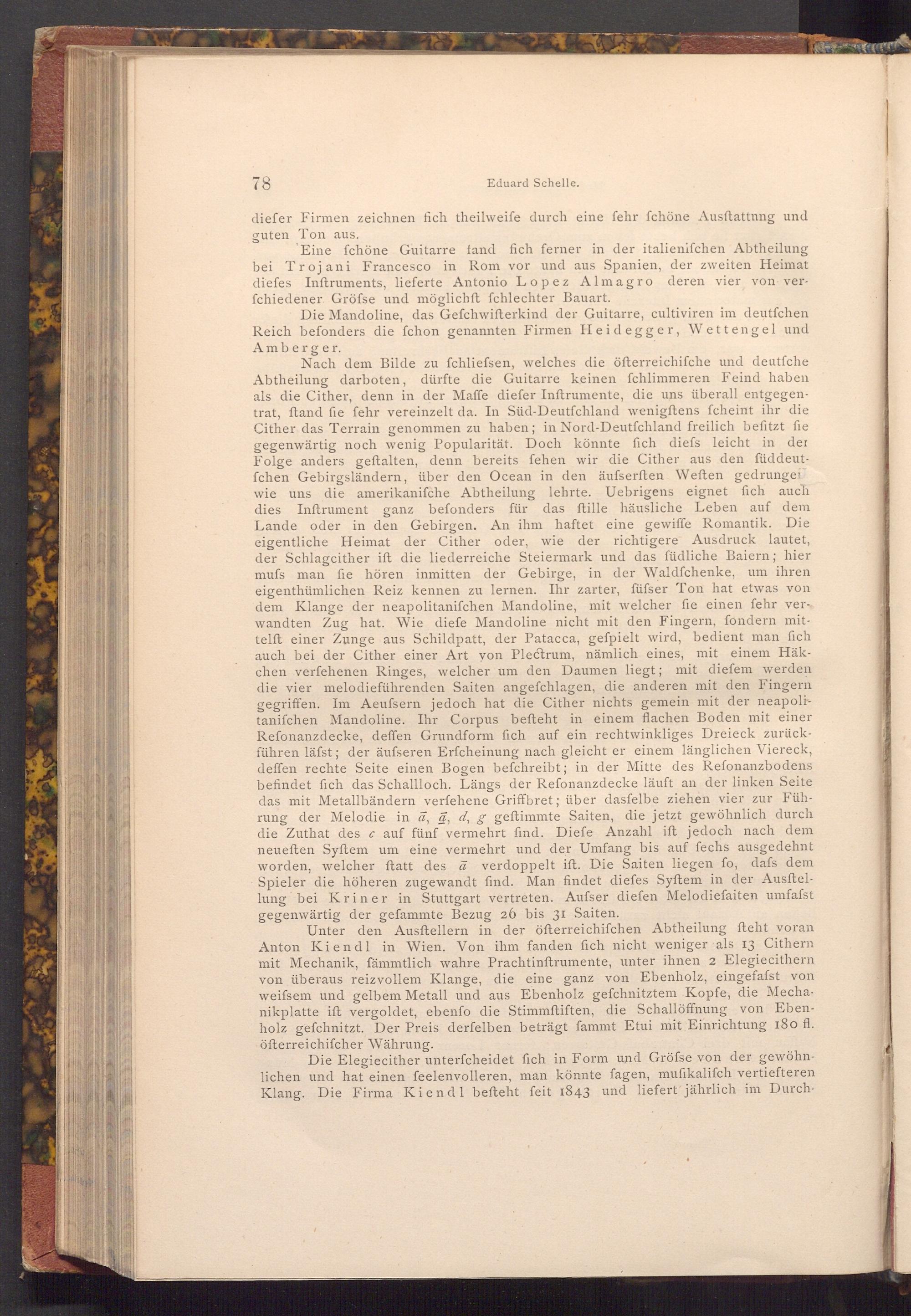 Unter den Ausftellern in der öfterreichifchen Abtheilung fteht voran Anton Kiendl in Wien. Von ihm fanden fich nicht weniger als 13 Cithern mit Mechanik, fämmtlich wahre Prachtinftrumente, unter ihnen 2 Elegiecithern von überaus reizvollem Klange, die eine ganz von Ebenholz, eingefafst von weifsem und gelbem Metall und aus Ebenholz gefchnitztem Kopfe, die Mechanikplatte ift vergoldet, ebenfo die Stimmftiften, die Schallöffnung von Ebenholz gefchnitzt. Der Preis derfelben beträgt fammt Etui mit Einrichtung 180 fl. öfterreichifcher Währung.