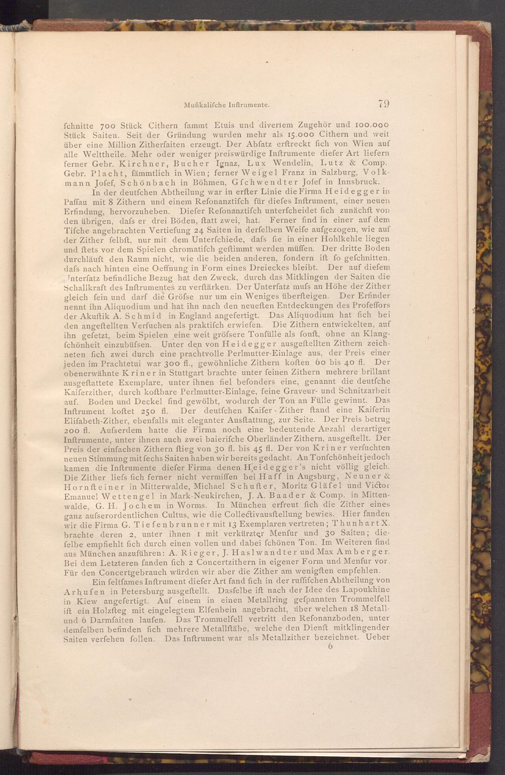fchnitte 700 Stück Cithern fammt Etuis und diveriem Zugehör und 100.000 Stück Saiten. Seit der Gründung wurden mehr als 15.000 Cithern und weit über eine Million Zitherfaiten erzeugt. Der Abfatz erftreckt fich von Wien auf alle Welttheile. Mehr oder weniger preiswürdige Inftrumente diefer Art liefern ferner Gebr. Kirchner, Bucher Ignaz, Lux Wendelin, Lutz& Comp. Gebr. Placht, fämmtlich in Wien; ferner Weigel Franz in Salzburg, Volkmann Jofef, Schönbach in Böhmen, Gfchwendter Jofef in Innsbruck.