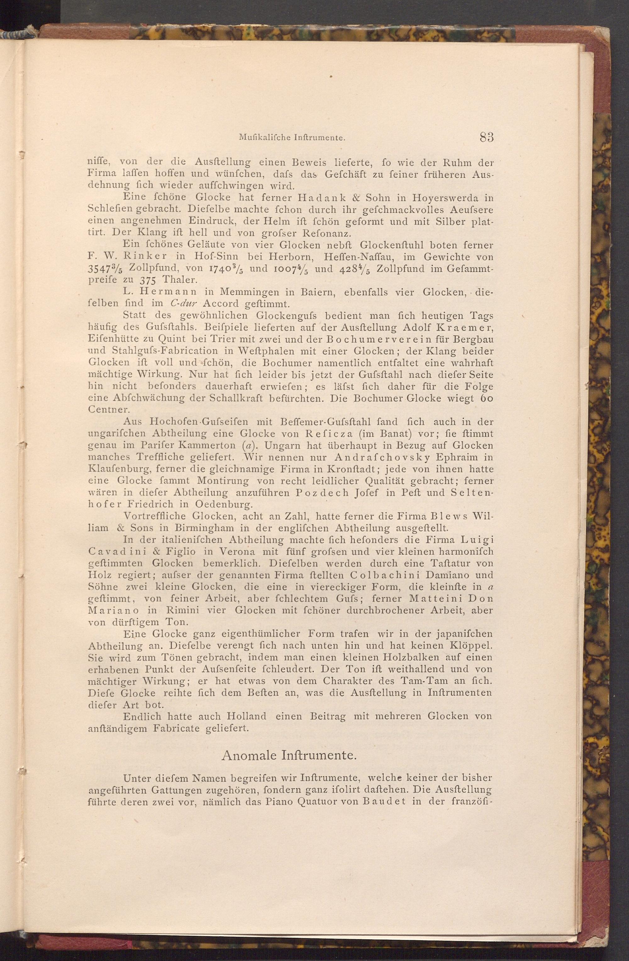 Aus Hochofen Gufseifen mit Beffemer- Gufsftahl fand fich auch in der ungarifchen Abtheilung eine Glocke von Reficza( im Banat) vor; fie ftimmt genau im Parifer Kammerton( a). Ungarn hat überhaupt in Bezug auf Glocken manches Treffliche geliefert. Wir nennen nur Andrafchovsky Ephraim in Klaufenburg, ferner die gleichnamige Firma in Kronftadt; jede von ihnen hatte eine Glocke fammt Montirung von recht leidlicher Qualität gebracht; ferner wären in diefer Abtheilung anzuführen Pozdech Jofef in Peft und Seltenhofer Friedrich in Oedenburg.
