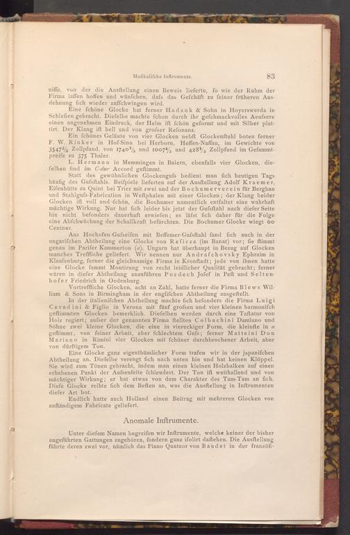 In der italienifchen Abtheilung machte fich hefonders die Firma Luigi Cavadini& Figlio in Verona mit fünf grofsen und vier kleinen harmonifch geftimmten Glocken bemerklich. Diefelben werden durch eine Taftatur von Holz regiert; aufser der genannten Firma ftellten Colbachini Damiano und Söhne zwei kleine Glocken, die eine in viereckiger Form, die kleinfte in a geftimmt, von feiner Arbeit, aber fchlechtem Gufs; ferner Matteini Don Mariano in Rimini vier Glocken mit fchöner durchbrochener Arbeit, aber von dürftigem Ton.