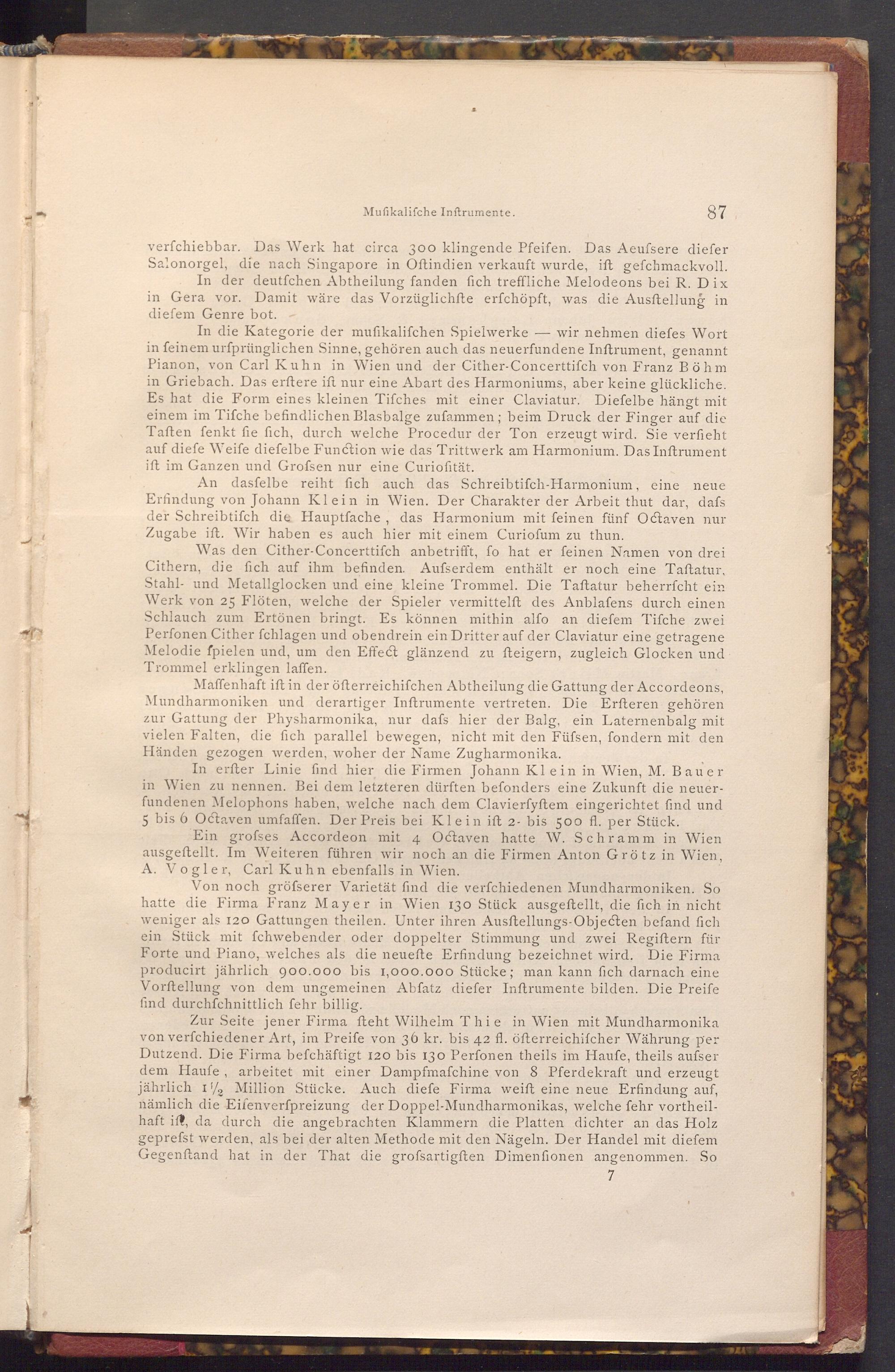 Zur Seite jener Firma fteht Wilhelm Thie in Wien mit Mundharmonika von verfchiedener Art, im Preife von 36 kr. bis 42 fl. öfterreichifcher Währung per Dutzend. Die Firma befchäftigt 120 bis 130 Perfonen theils im Haufe, theils aufser dem Haufe, arbeitet mit einer Dampfmafchine von 8 Pferdekraft und erzeugt jährlich 1 Million Stücke. Auch diefe Firma weift eine neue Erfindung auf, nämlich die Eifenverfpreizung der Doppel- Mundharmonikas, welche fehr vortheilhaft if, da durch die angebrachten Klammern die Platten dichter an das Holz geprefst werden, als bei der alten Methode mit den Nägeln. Der Handel mit diefem Gegenftand hat in der That die grofsartigften Dimenfionen angenommen. So