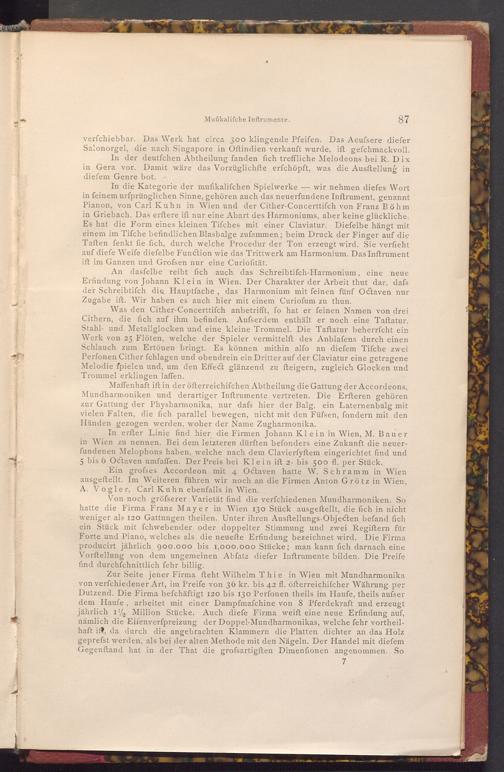 Ein grofses Accordeon mit 4 Octaven hatte W. Schramm in Wien ausgeftellt. Im Weiteren führen wir noch an die Firmen Anton Grötz in Wien, A. Vogler, Carl Kuhn ebenfalls in Wien.