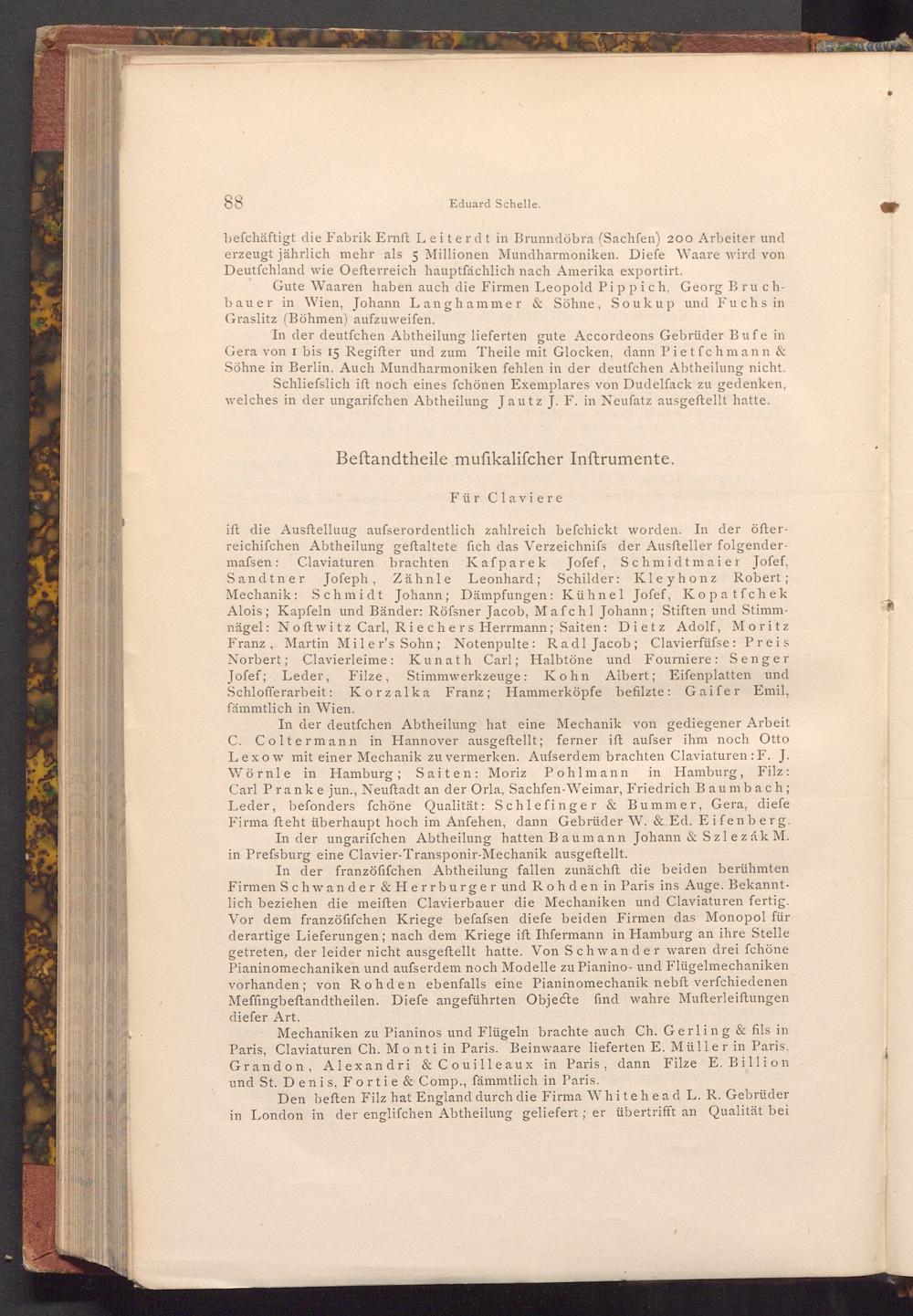 In der deutfchen Abtheilung hat eine Mechanik von gediegener Arbeit C. Coltermann in Hannover ausgeftellt; ferner ift aufser ihm noch Otto Lexow mit einer Mechanik zu vermerken. Aufserdem brachten Claviaturen: F. J. Wörnle in Hamburg; Saiten: Moriz Pohlmann in Hamburg, Filz: Carl Pranke jun., Neuftadt an der Orla, Sachfen- Weimar, Friedrich Baumbach; Leder, befonders fchöne Qualität: Schlefinger& Bummer, Gera, diefe Firma fteht überhaupt hoch im Anfehen, dann Gebrüder W.& Ed. Eifenberg. In der ungarifchen Abtheilung hatten Baumann Johann& Szlezák M. in Prefsburg eine Clavier- Transponir- Mechanik ausgeftellt.
