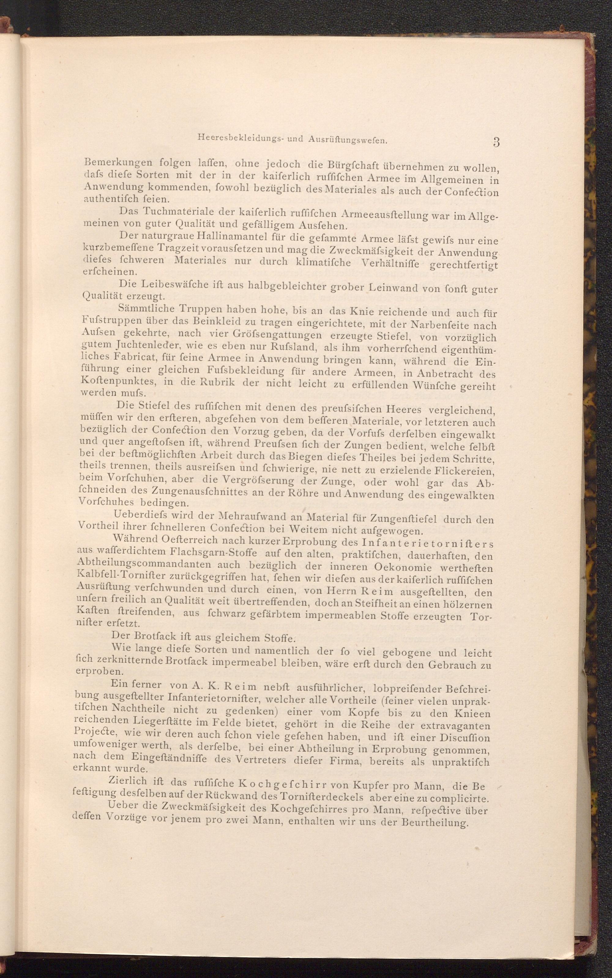 Die Stiefel des ruffifchen mit denen des preufsifchen Heeres vergleichend, müffen wir den erfteren, abgefehen von dem befferen Materiale, vor letzteren auch bezüglich der Confection den Vorzug geben, da der Vorfufs derfelben eingewalkt und quer angeftofsen ift, während Preufsen fich der Zungen bedient, welche felbft bei der beftmöglichften Arbeit durch das Biegen diefes Theiles bei jedem Schritte, theils trennen, theils ausreifsen und fchwierige, nie nett zu erzielende Flickereien, beim Vorfchuhen, aber die Vergröfserung der Zunge, oder wohl gar das Abfchneiden des Zungenausfchnittes an der Röhre und Anwendung des eingewalkten Vorfchuhes bedingen.