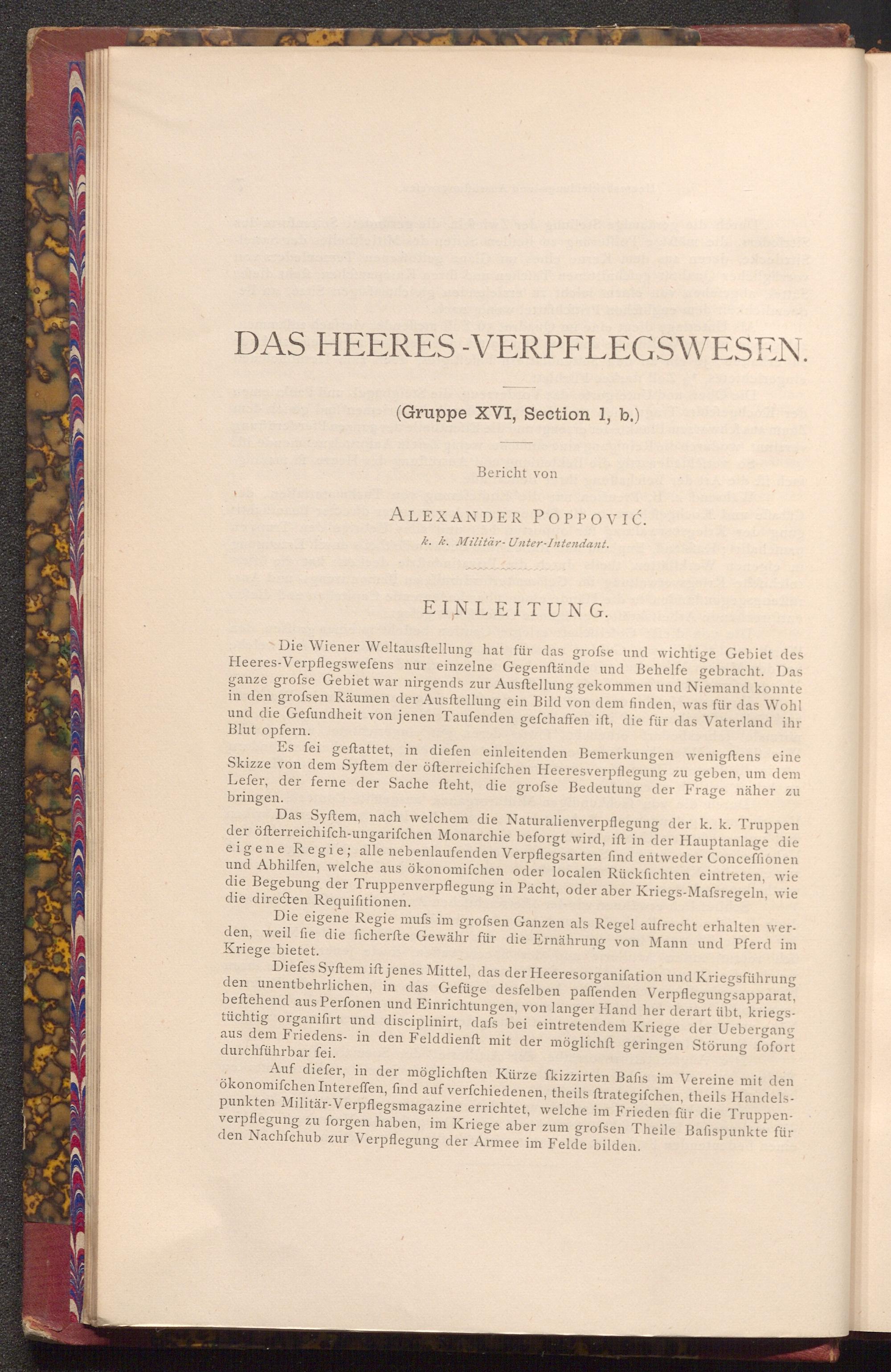 Die Wiener Weltausftellung hat für das grofse und wichtige Gebiet des Heeres- Verpflegswefens nur einzelne Gegenftände und Behelfe gebracht. Das ganze grofse Gebiet war nirgends zur Ausftellung gekommen und Niemand konnte in den grofsen Räumen der Ausftellung ein Bild von dem finden, was für das Wohl und die Gefundheit von jenen Taufenden gefchaffen ift, die für das Vaterland ihr Blut opfern.