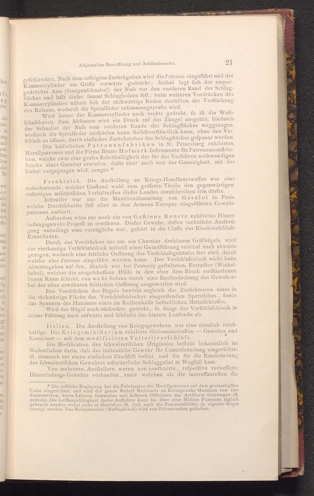Frankreich. Die Ausftellung an Kriegs- Handfeuerwaffen war eine unbedeutende, welcher Umftand wohl zum gröfsten Theile den gegenwärtigen unfertigen militärifchen Verhältniffen diefes Landes zuzufchreiben fein dürfte. Inftructiv war nur die Munitionsfammlung von Gevelot in Paris, welche Durchfchnitte faft aller in den Armeen Europas eingeführten Gewehrpatronen enthielt.