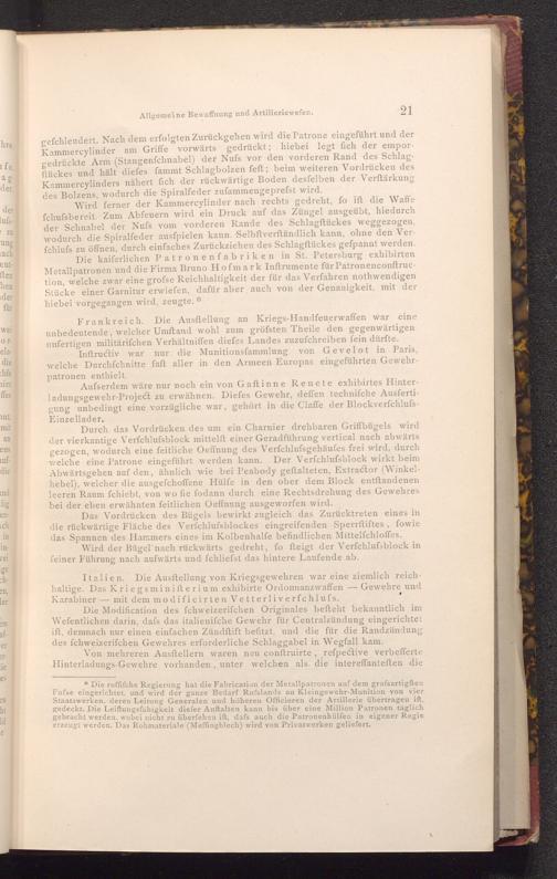 Wird ferner der Kammercylinder nach rechts gedreht, fo ift die Waffe fchufsbereit. Zum Abfeuern wird ein Druck auf das Züngel ausgeübt, hiedurch der Schnabel der Nufs vom vorderen Rande des Schlagftückes weggezogen, wodurch die Spiralfeder ausfpielen kann. Selbſtverſtändlich kann, ohne den Verfchlufs zu öffnen, durch einfaches Zurückziehen des Schlagftückes gefpannt werden. Die kaiferlichen Patronenfabriken in St. Petersburg exhibirten. Metallpatronen und die Firma Bruno Hofmark Inftrumente für Patronenconftruction, welche zwar eine grofse Reichhaltigkeit der für das Verfahren nothwendigen Stücke einer Garnitur erwiefen, dafür aber auch von der Genauigkeit, mit der hiebei vorgegangen wird, zeugte.*