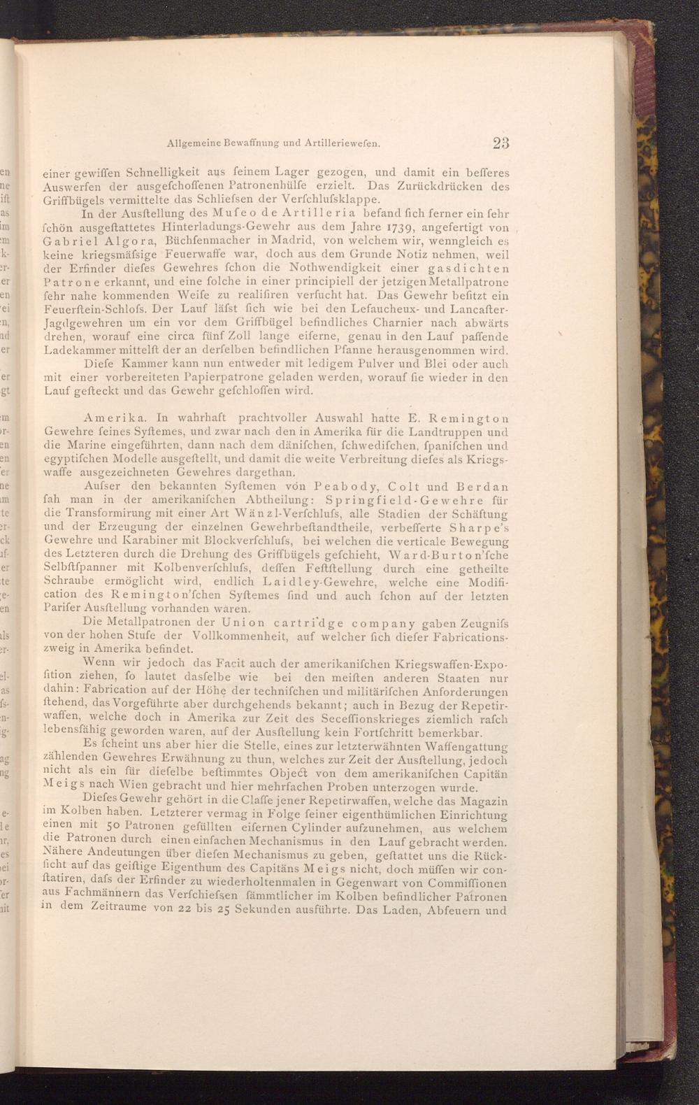 Aufser den bekannten Syftemen von Peabody, Colt und Berdan fah man in der amerikaniſchen Abtheilung: Springfield- Gewehre für die Transformirung mit einer Art Wänzl- Verfchlufs, alle Stadien der Schäftung und der Erzeugung der einzelnen Gewehrbeftandtheile, verbefferte Sharpe's Gewehre und Karabiner mit Blockverfchlufs, bei welchen die verticale Bewegung des Letzteren durch die Drehung des Griffbügels gefchieht, Ward- Burton'fche Selbftfpanner mit Kolbenverfchlufs, deffen Feftftellung durch eine getheilte Schraube ermöglicht wird, endlich Laidley- Gewehre, welche eine Modification des Remington'fchen Syftemes find und auch fchon auf der letzten Parifer Ausftellung vorhanden waren.