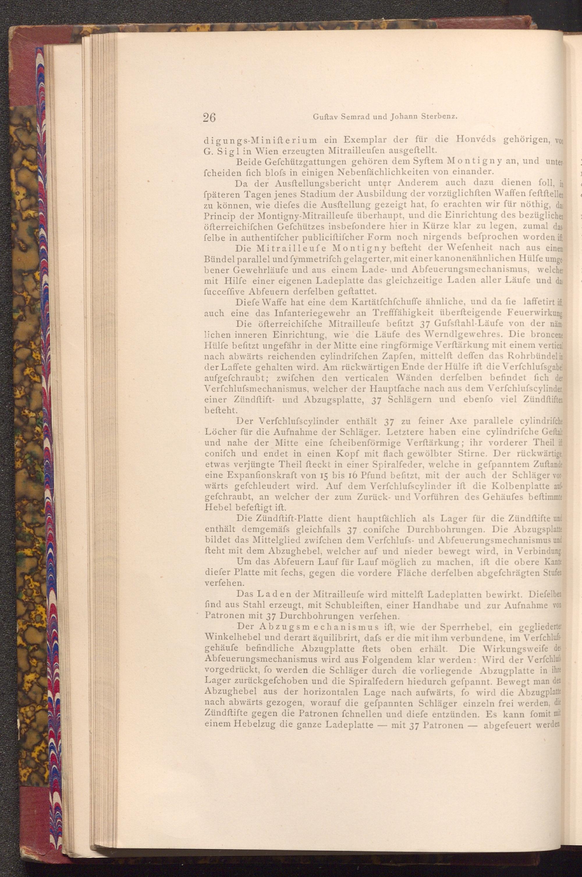 Da der Ausftellungsbericht unter Anderem auch dazu dienen foll, in fpäteren Tagen jenes Stadium der Ausbildung der vorzüglichften Waffen feftfteller zu können, wie diefes die Ausftellung gezeigt hat, fo erachten wir für nöthig, das Princip der Montigny- Mitrailleufe überhaupt, und die Einrichtung des bezüglicher öfterreichifchen Gefchützes insbefondere hier in Kürze klar zu legen, zumal das felbe in authentifcher publiciftifcher Form noch nirgends befprochen worden if Die Mitrailleufe Montigny befteht der Wefenheit nach aus einem Bündel parallel und fymmetriſch gelagerter, mit einer kanonenähnlichen Hülfe umge bener Gewehrläufe und aus einem Lade- und Abfeuerungsmechanismus, welcher mit Hilfe einer eigenen Ladeplatte das gleichzeitige Laden aller Läufe und das fucceffive Abfeuern derfelben geftattet.