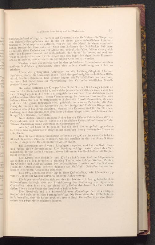Dermalen beftehen die Krup p'fchen Schiffs- und Küft engefchütze aus einer ft arken Kernröhre, auf welche je nach dem Kaliber eine, zwei bis drei Ringlagen mit Preffion aufgefchoben werden. Das Aufziehen diefer gefchmiedeten Stahlringe, deren Verminderung im inneren Durchmeffer zum äufseren Diameter der zu umfpannenden Rohrtheile fowohl theoretifch, als auch praktiſch fehr genau feftgeftellt wird, gefchieht im warmen Zuftande; die Ausübung der Preffion auf die Kernröhre und der innige Anfchlufs der Ringe untereinander erfolgt bei ihrem Erkalten. Sämmtliche Kanonen find für die Hinterladung nach dem preufsifchen( Preffions-) Syftem eingerichtet, und befitzen den Krupp'fchen Rundkeil- Verfchlufs.
