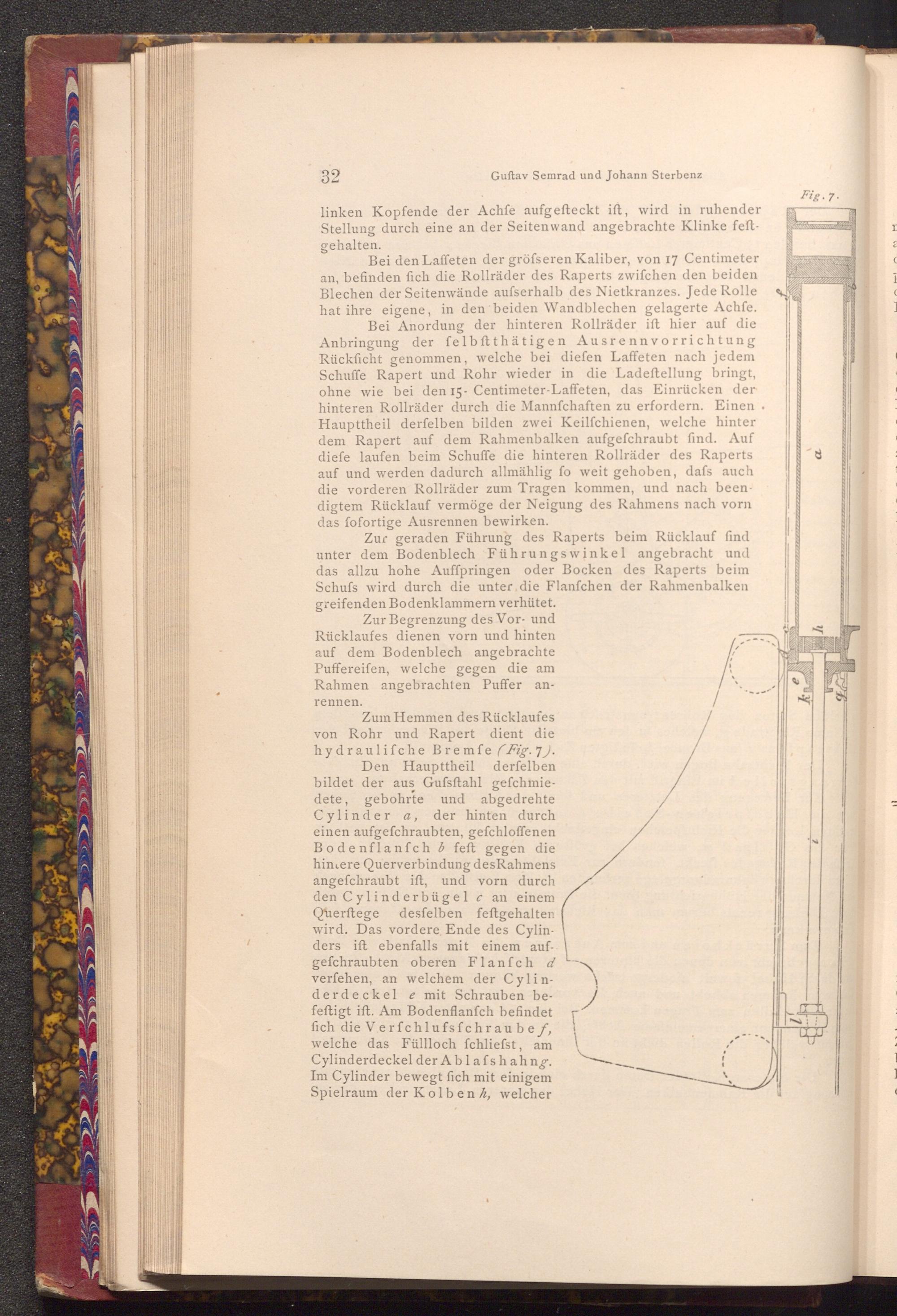 Zum Hemmen des Rücklaufes von Rohr und Rapert dient die hydraulifche Bremfe( Fig. 7). Den Haupttheil derfelben bildet der aus Gufsftahl gefchmiedete, gebohrte und abgedrehte Cylinder a, der hinten durch einen aufgefchraubten, gefchloffenen Bodenflanfch b feft gegen die hintere Querverbindung des Rahmens angefchraubt ift, und vorn durch den Cylinderbügel c an einem Querftege desfelben feftgehalten wird. Das vordere Ende des Cylinders ift ebenfalls mit einem aufgefchraubten oberen Flanfch d verfehen, an welchem der Cylinderdeckel e mit Schrauben befeftigt ift. Am Bodenflanfch befindet fich die Verfchlufsfchraubef, welche das Füllloch fchliefst, am Cylinderdeckel der Ablafs hahng. Im Cylinder bewegt fich mit einigem Spielraum der Kolben h, welcher