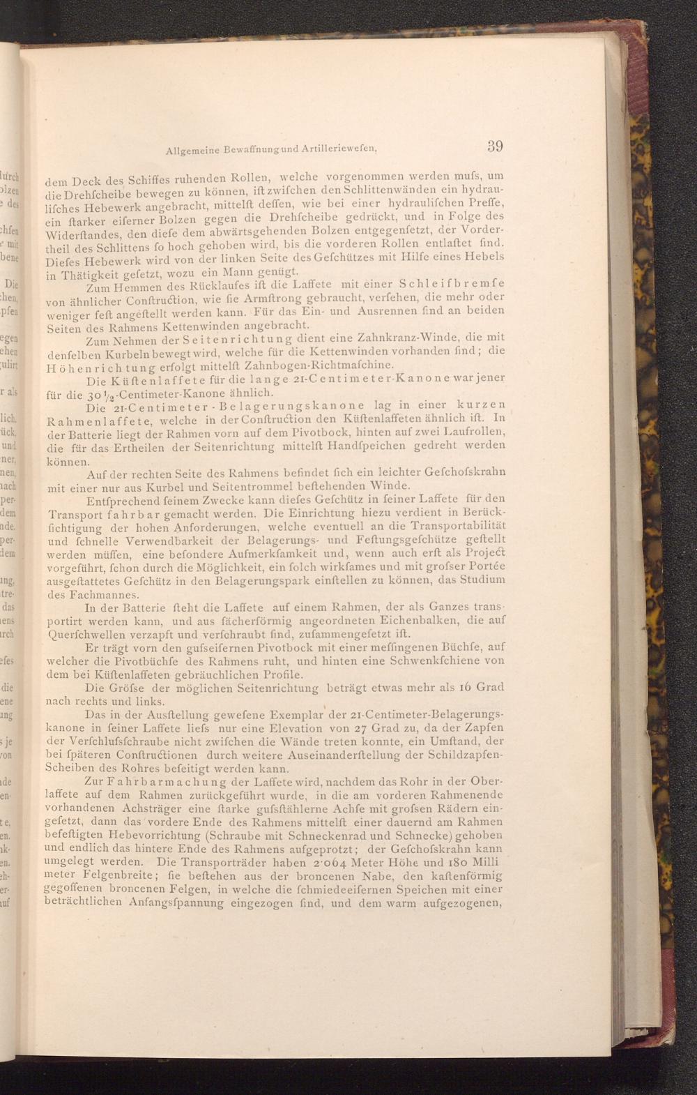 Die 21- Centimeter Belagerungskanone lag in einer kurzen Rahmenlaffete, welche in der Conftruction den Küftenlaffeten ähnlich ift. In der Batterie liegt der Rahmen vorn auf dem Pivotbock, hinten auf zwei Laufrollen, die für das Ertheilen der Seitenrichtung mittelft Handfpeichen gedreht werden können.