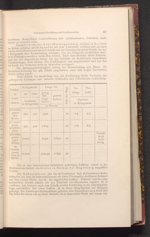 Das 21- Centimeter- Rohr( Marinegefchütz), welches in Bochum im Rohen gefertigt und in Spandau mit dem Verfchluffe verfehen und gezogen wurde, ift zur Dauerprobe mit 500 Schufs und zur Gewaltprobe mit 50 Schufs, die mit I Kilogramm über Normalladung erfolgten, von der königlich preufsifchen Artillerie- Prüfungscommiffion befchoffen worden. Nach dem Berichte diefer Behörde und wie der Augenfchein lehrte, hat das Gefchütz im Rohrkörper bemerkbare Veränderungen nicht erlitten. Die Trefffähigkeit war ausgezeichnet und hat fich im Laufe des Verfuches nicht im Mindeflen verringert.