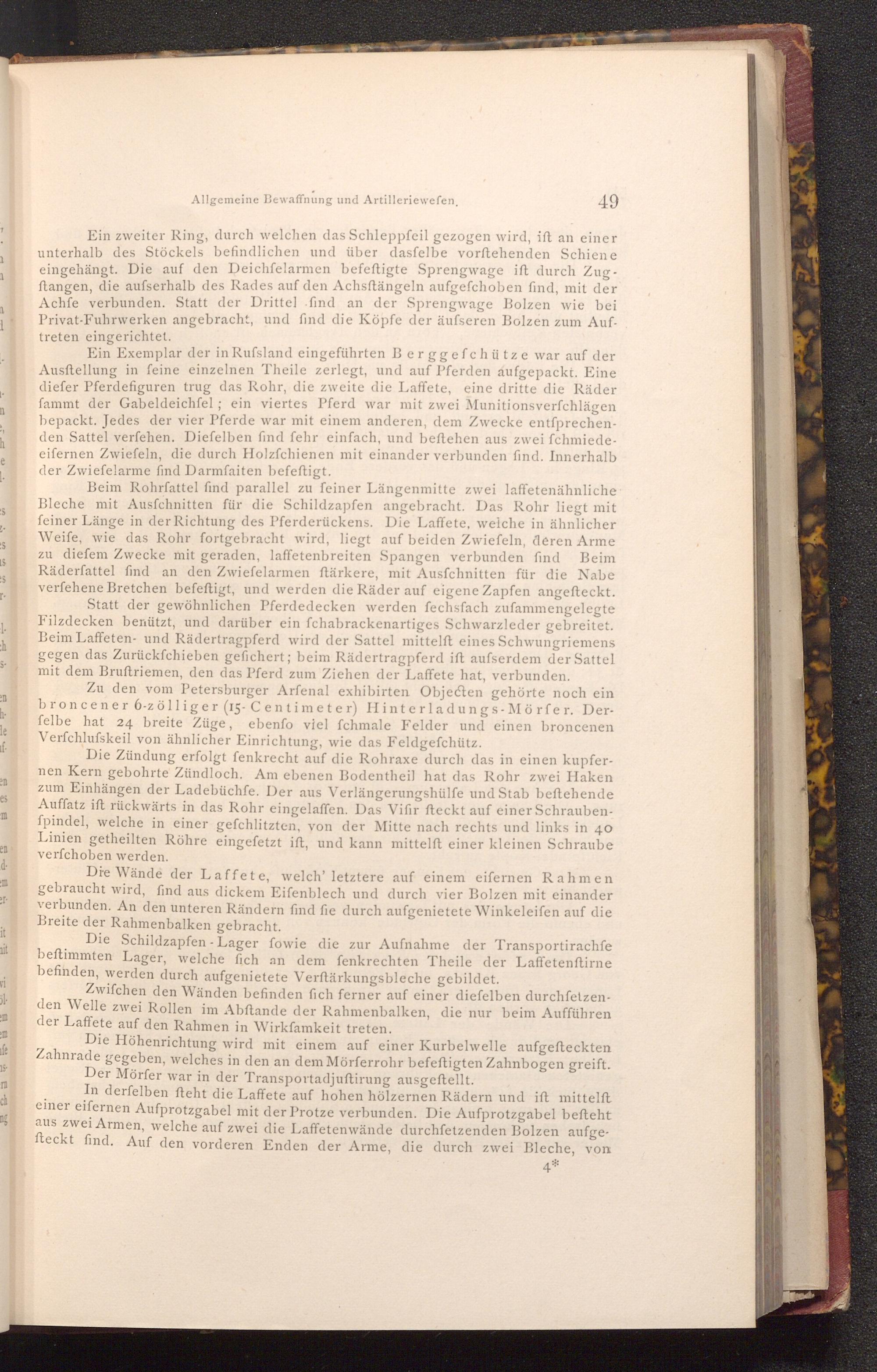 Zu den vom Petersburger Arfenal exhibirten Objecten gehörte noch ein broncen er 6- zölliger( 15- Centimeter) Hinterladungs- Mörfer. Derfelbe hat 24 breite Züge, ebenfo viel fchmale Felder und einen broncenen Verfchlufskeil von ähnlicher Einrichtung, wie das Feldgefchütz.