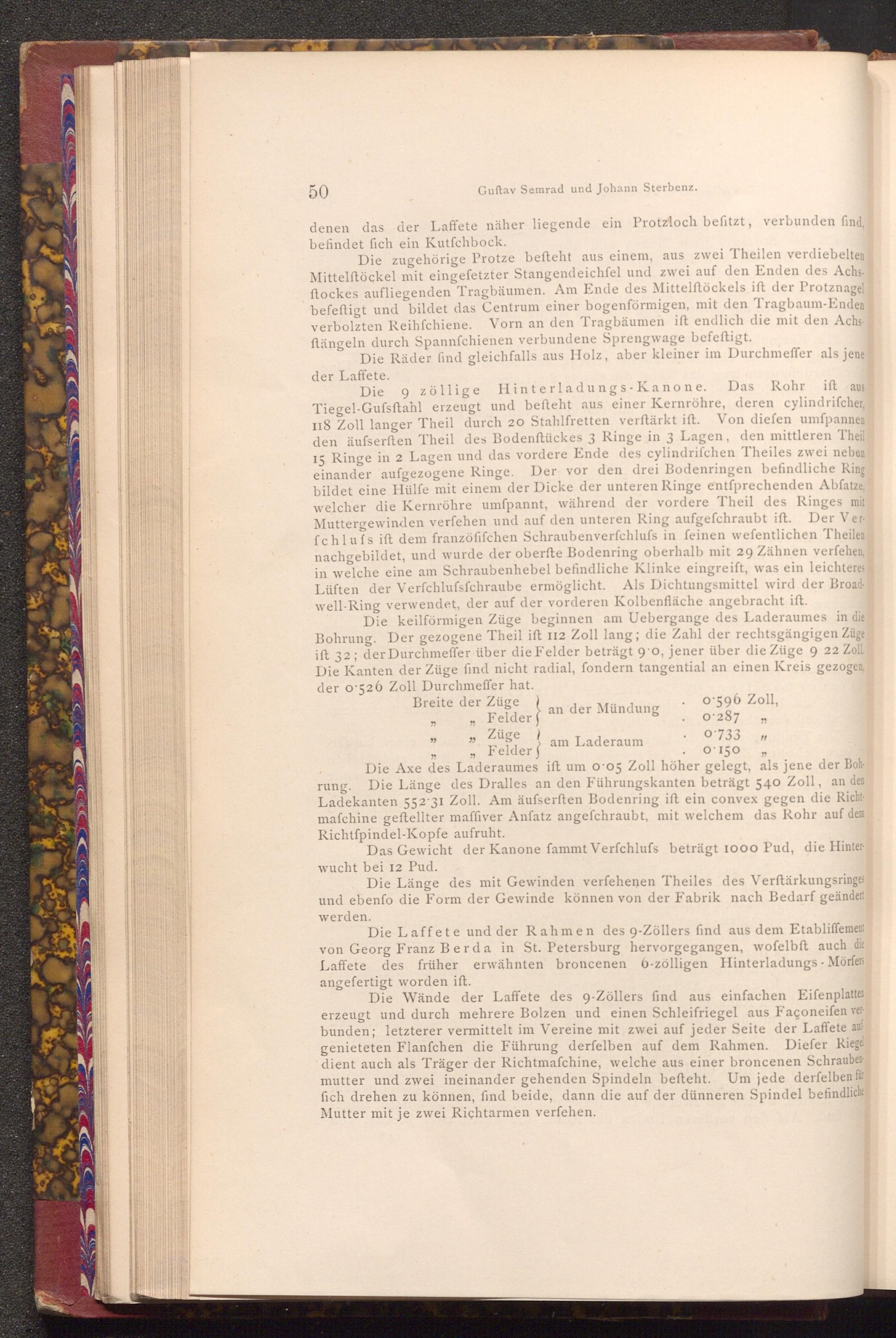 Die Laffete und der Rahmen des 9- Zöllers find aus dem Etabliffement von Georg Franz Berda in St. Petersburg hervorgegangen, wofelbft auch die Laffete des früher erwähnten broncenen 6- zölligen Hinterladungs- Mörfers angefertigt worden ift.