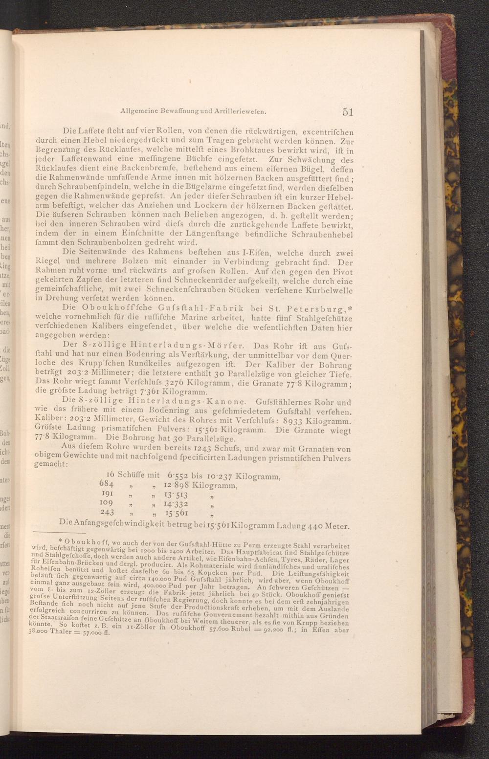 * Oboukhoff, wo auch der von der Gufsftahl- Hütte zu Perm erzeugte Stahl verarbeitet wird, befchäftigt gegenwärtig bei 1200 bis 1400 Arbeiter. Das Hauptfabricat find Stahlgefchütze und Stahlgefchoffe, doch werden auch andere Artikel, wie Eifenbahn- Achfen, Tyres, Räder, Lager für Eifenbahn- Brücken und dergl. producirt. Als Rohmateriale wird finnländifches und uralifches Roheifen benützt und koftet dasfelbe 60 bis 65 Kopeken per Pud. beläuft fich gegenwärtig auf circa 140.000 Pud Gufsftahl jährlich, wird aber, wenn Oboukhoff Die Leiftungsfähigkeit einmal ganz ausgebaut fein wird, 400.000 Pud per Jahr betragen. An fchweren Gefchützen vom ε- bis zum 12- Zöller erzeugt die Fabrik jetzt jährlich bei 40 Stück. Oboukhoff geniefst grofse Unterftützung Seitens der ruffifchen Regierung, doch konnte es bei dem erft zehnjährigen Beftande fich noch nicht auf jene Stufe der Productionskraft erheben, um mit dem Auslande erfolgreich concurriren zu können. Das ruffifche Gouvernement bezahlt mithin aus Gründen der Staatsraifon feine Gefchütze an Oboukhoff bei Weitem theuerer, als es fie von Krupp beziehen könnte. So koftet z. B. ein 11- Zöller in Oboukhoff 57.600 Rubel 38.000 Thaler = 92.200 fl.; in Effen aber