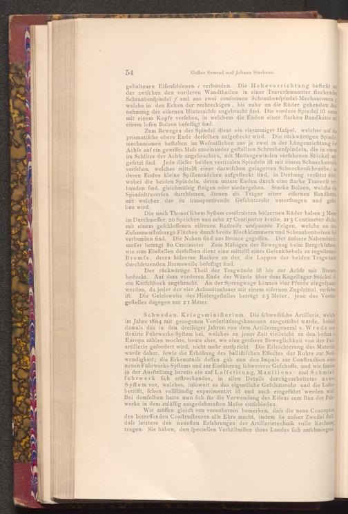 Schweden. Kriegsminifterium. Die fchwediſche Artillerie, welche im Jahre 1864 mit gezogenen Vorderladungskanonen ausgerüftet wurde, behiel damals das in den dreifsiger Jahren von dem Artilleriegeneral v. Wrede con ftruirte Fuhrwerks- Syftem bei, welches zu jener Zeit vielleicht zu den beften in Europa zählen mochte, heute aber, wo eine gröfsere Beweglichkeit von der Feld artillerie gefordert wird, nicht mehr entspricht Die Erleichterung des Materials wurde daher, fowie die Erhöhung des balliftifchen Effectes der Rohre zur Noth wendigkeit; die Erkenntnifs deffen gab nun den Impuls zur Conftruction eines neuen Fuhrwerks- Syftems und zur Einführung fchwererer Gefchoffe, und wir fanden in der Ausstellung bereits ein auf Laffetirung, Munitions- und Schmied fuhrwerk fich erftreckendes, in allen Details durchgearbeitetes neues Syftem vor, welches, infoweit es das eigentliche Gefchützrohr und die Laffete betrifft, fchon vollſtändig experimentirt ift und auch eingeführt werden wird Bei demfelben hatte man fich für die Verwendung des Eifens zum Bau der Fuhr werke in dem zuläffig ausgedehnteften Mafse entfchieden.