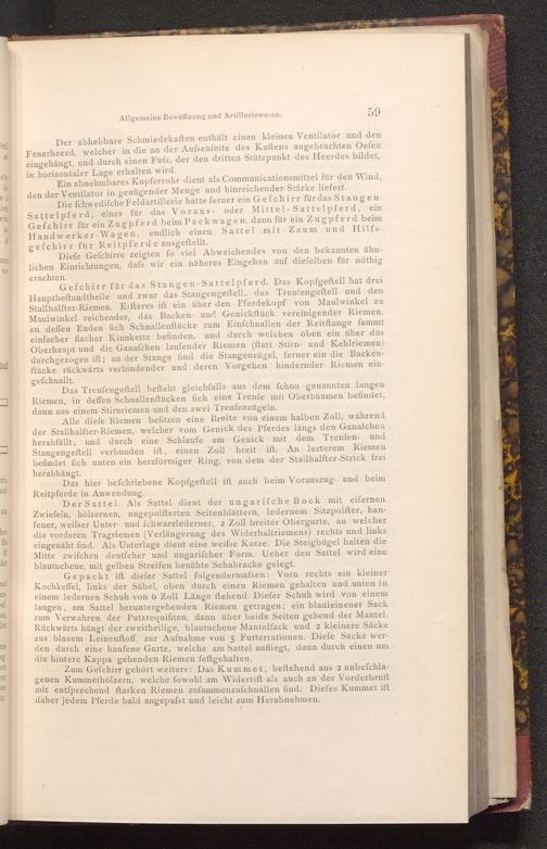 Gepackt ift diefer Sattel folgendermafsen: Vorn rechts ein kleiner Kochkeffel, links der Säbel, oben durch einen Riemen gehalten und unten in einem ledernen Schuh von 6 Zoll Länge ftehend. Diefer Schuh wird von einem langen, am Sattel heruntergehenden Riemen getragen; ein blauleinener Sack zum Verwahren der Putzrequifiten, dann über beide Seiten gehend der Mantel. Rückwärts hängt der zweitheilige, blautuchene Mantelfack und 2 kleinere Säcke aus blauem Leinenftoff zur Aufnahme von 5 Futterrationen. Diefe Säcke werden durch eine hanfene Gurte, welche am Sattel aufliegt, dann durch einen um die hintere Kappa gehenden Riemen feftgehalten.