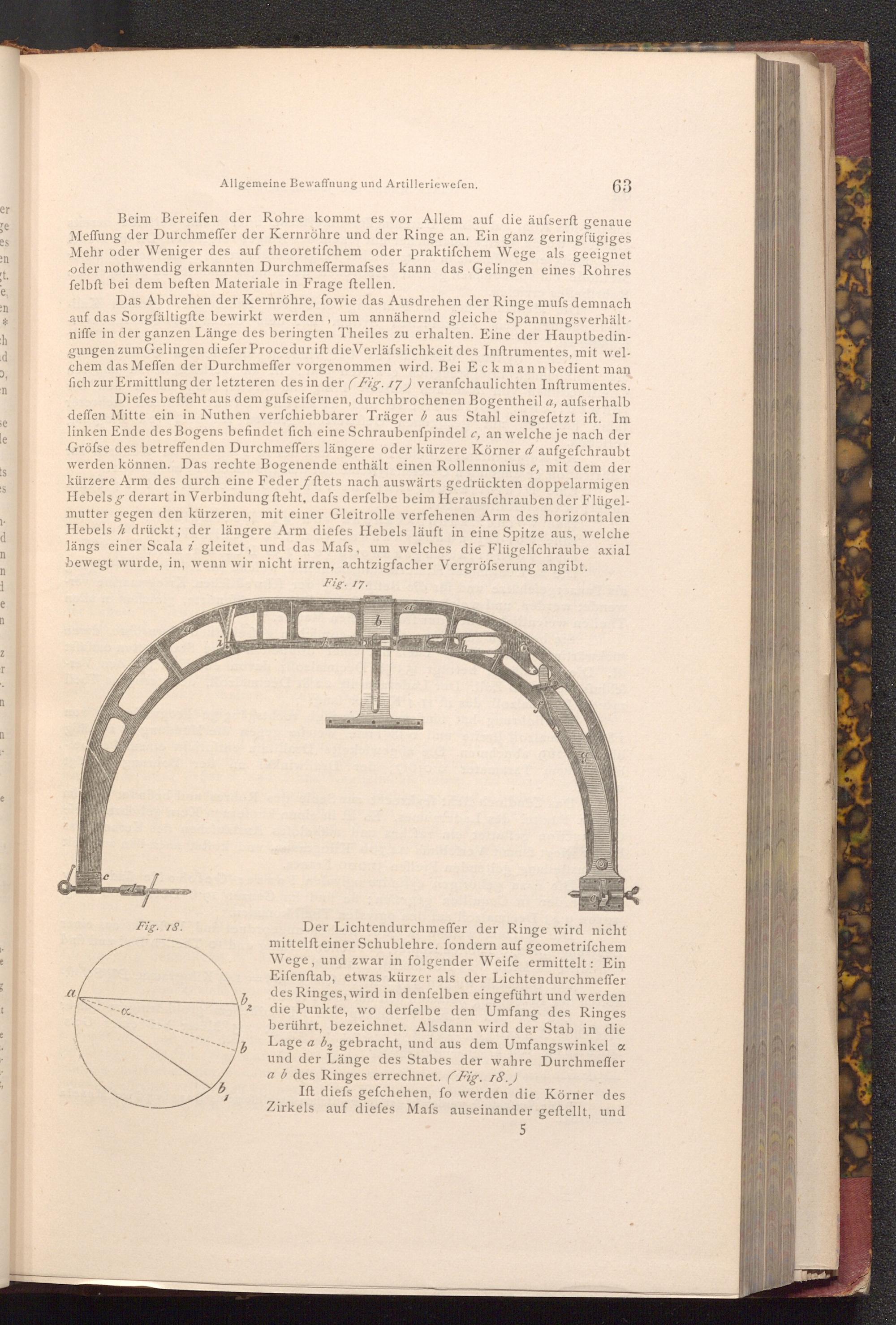 Das Abdrehen der Kernröhre, fowie das Ausdrehen der Ringe mufs demnach auf das Sorgfältigfte bewirkt werden, um annähernd gleiche Spannungsverhältniffe in der ganzen Länge des beringten Theiles zu erhalten. Eine der Hauptbedingungen zum Gelingen diefer Procedur ift die Verläfslichkeit des Inftrumentes, mit welchem das Meffen der Durchmeffer vorgenommen wird. Bei Eckmann bedient man fich zur Ermittlung der letzteren des in der( Fig. 17) veranfchaulichten Inftrumentes. Diefes befteht aus dem gufseifernen, durchbrochenen Bogentheil a, aufserhalb deffen Mitte ein in Nuthen verfchiebbarer Träger 6 aus Stahl eingefetzt ift. Im linken Ende des Bogens befindet fich eine Schraubenfpindel c, an welche je nach der Gröfse des betreffenden Durchmeffers längere oder kürzere Körner d aufgefchraubt werden können. Das rechte Bogenende enthält einen Rollennonius e, mit dem der kürzere Arm des durch eine Feder fftets nach auswärts gedrückten doppelarmigen Hebels g derart in Verbindung fteht, dafs derfelbe beim Herausfchrauben der Flügelmutter gegen den kürzeren, mit einer Gleitrolle verfehenen Arm des horizontalen Hebels drückt; der längere Arm diefes Hebels läuft in eine Spitze aus, welche längs einer Scala i gleitet, und das Mafs, um welches die Flügelfchraube axial bewegt wurde, in, wenn wir nicht irren, achtzigfacher Vergröfserung angibt. Fig. 17.