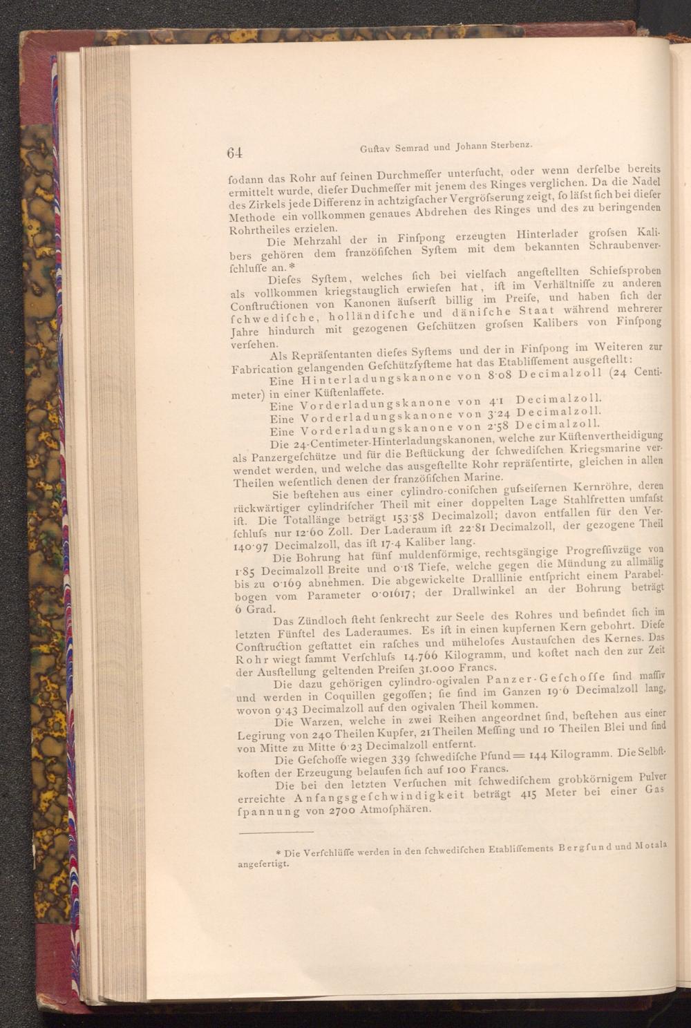 Die 24- Centimeter- Hinterladungskanonen, welche zur Küftenvertheidigung als Panzergefchütze und für die Beftückung der fchwedifchen Kriegsmarine verwendet werden, und welche das ausgeftellte Rohr repräfentirte, gleichen in allen Theilen wefentlich denen der franzöfifchen Marine.