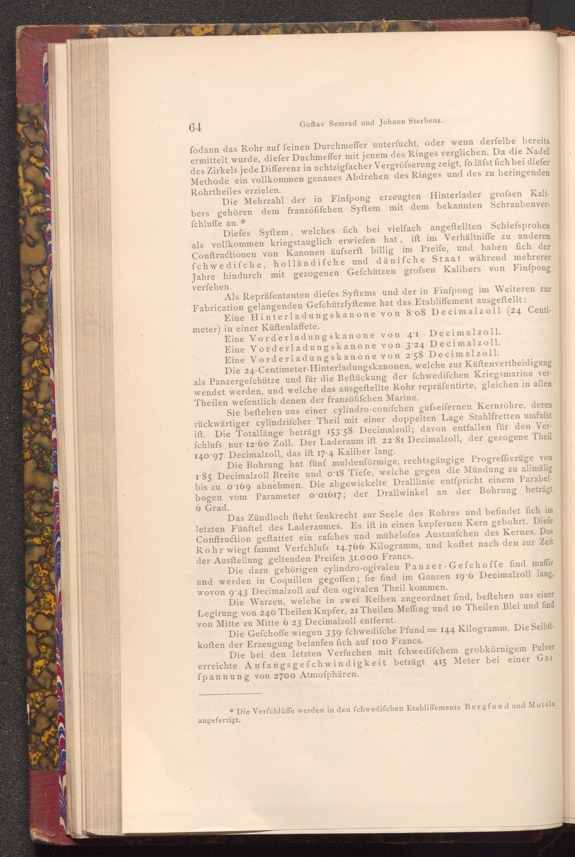 Die bei den letzten Verfuchen mit fchwedifchem grobkörnigem Pulver erreichte Anfangsgefchwindigkeit beträgt 415 Meter bei einer Gas fpannung von 2700 Atmoſphären.