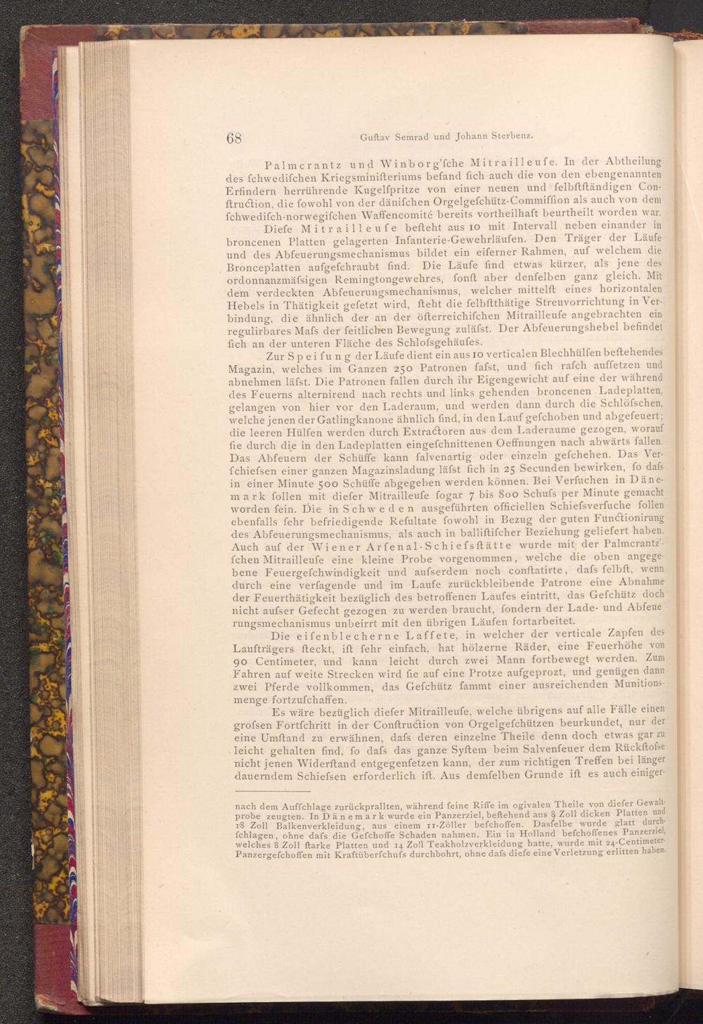 Zur Speifung der Läufe dient ein aus 10 verticalen Blechhülfen beftehendes Magazin, welches im Ganzen 250 Patronen fafst, und fich rafch auffetzen und abnehmen läfst. Die Patronen fallen durch ihr Eigengewicht auf eine der während des Feuerns alternirend nach rechts und links gehenden broncenen Ladeplatten, gelangen von hier vor den Laderaum, und werden dann durch die Schlöfschen, welche jenen der Gatlingkanone ähnlich find, in den Lauf gefchoben und abgefeuert; die leeren Hülfen werden durch Extractoren aus dem Laderaume gezogen, worauf fie durch die in den Ladeplatten eingefchnittenen Oeffnungen nach abwärts fallen. Das Abfeuern der Schüffe kann falvenartig oder einzeln gefchehen. Das Verfchiefsen einer ganzen Magazinsladung läfst fich in 25 Secunden bewirken, fo dafs in einer Minute 500 Schüffe abgegeben werden können. Bei Verfuchen in Dänemark follen mit diefer Mitrailleufe fogar 7 bis 800 Schufs per Minute gemacht worden fein. Die in Schweden ausgeführten officiellen Schiefsverfuche follen ebenfalls fehr befriedigende Refultate fowohl in Bezug der guten Functionirung des Abfeuerungsmechanismus, als auch in balliftifcher Beziehung geliefert haben. Auch auf der Wiener Arfenal- Schiefsftätte wurde mit der Palmcrantz'fchen Mitrailleufe eine kleine Probe vorgenommen, welche die oben angege bene Feuergefchwindigkeit und aufserdem noch conftatirte, dafs felbft, wenn durch eine verfagende und im Laufe zurückbleibende Patrone eine Abnahme der Feuerthätigkeit bezüglich des betroffenen Laufes eintritt, das Gefchütz doch nicht aufser Gefecht gezogen zu werden braucht, fondern der Lade- und Abfeue rungsmechanismus unbeirrt mit den übrigen Läufen fortarbeitet.