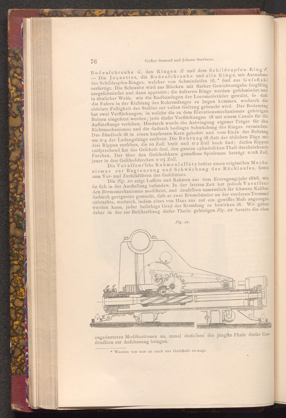 Die Fig. 20 zeigt Laffete und Rahmen aus dem Erzeugungsjahr 1868, wie fie fich in der Ausftellung befanden. In der letzten Zeit hat jedoch Vavaffeur den Bremsmechanismus modificirt, und denfelben namentlich für fchwere Kaliber dadurch geeigneter gemacht, dafs er zwei Bremsbänder an der vorderen Trommel anbrachte, wodurch, indem eines von Haus aus auf ein gewiffes Mafs angezogen werden kann, jeder beliebige Grad der Bremfung zu bewirken ift. Wir geben daher in der zur Befchreibung diefer Theile gehörigen Fig. 22 bereits die eben