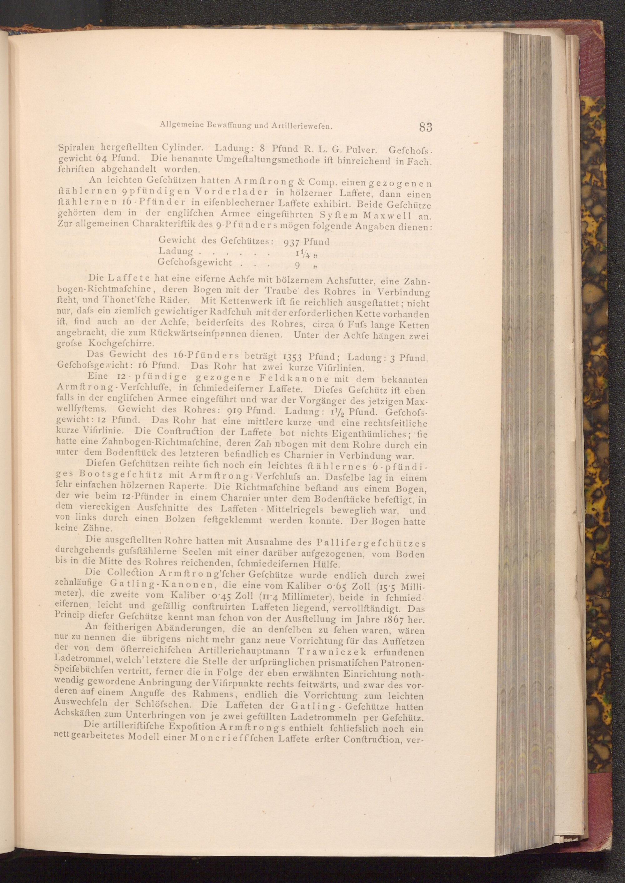 Die Collection Armstrong'fcher Gefchütze wurde endlich durch zwei zehnläufige Gatling- Kanonen, die eine vom Kaliber o 65 Zoll( 15.5 Millimeter), die zweite vom Kaliber 0'45 Zoll( 11 4 Millimeter), beide in fchmiedeifernen, leicht und gefällig conftruirten Laffeten liegend, vervollſtändigt. Das Princip diefer Gefchütze kennt man fchon von der Ausftellung im Jahre 1867 her.