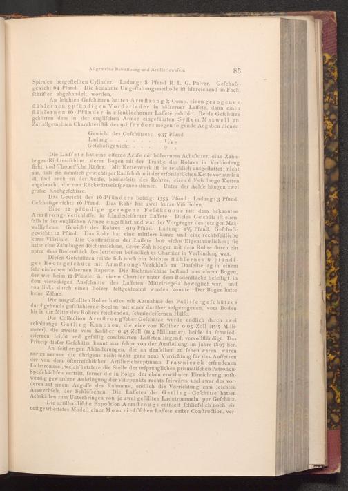 Eine 12 pfündige gezogene Feldkanone mit dem bekannten Armstrong Verfchluffe, in fchmiedeiferner Laffete. Diefes Gefchütz ift eben falls in der englifchen Armee eingeführt und war der Vorgänger des jetzigen Maxwellfyftems. Gewicht des Rohres: 919 Pfund. Ladung: 12 Pfund. Gefchofsgewicht: 12 Pfund. Das Rohr hat eine mittlere kurze und eine rechtsfeitliche kurze Vifirlinie. Die Conftruction der Laffete bot nichts Eigenthümliches; fie hatte eine Zahnbogen- Richtmaſchine, deren Zah nbogen mit dem Rohre durch ein unter dem Bodenftück des letzteren befindlich es Charnier in Verbindung war.