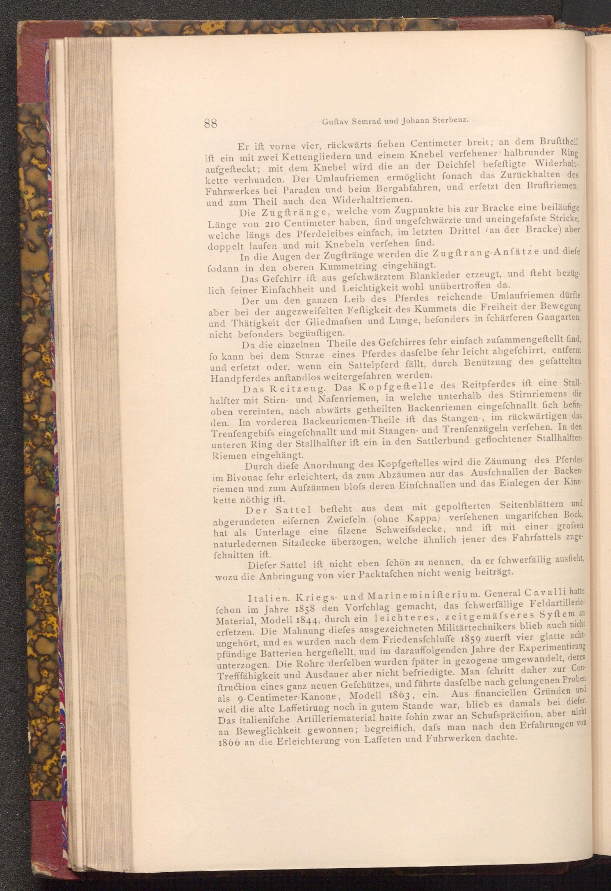 Italien. Kriegs- und Marineminifterium. General Cavalli hatte fchon im Jahre 1858 den Vorfchlag gemacht, das fchwerfällige FeldartillerieMaterial, Modell 1844, durch ein leichteres, zeitgemäfseres Syftem zu erfetzen. Die Mahnung diefes ausgezeichneten Militärtechnikers blieb auch nicht ungehört, und es wurden nach dem Friedensfchluffe 1859 zuerft vier glatte acht pfündige Batterien hergeftellt, und im darauffolgenden Jahre der Experimentirung unterzogen. Die Rohre derfelben wurden später in gezogene umgewandelt, deren Trefffähigkeit und Ausdauer aber nicht befriedigte. Man fchritt daher zur Conftruction eines ganz neuen Gefchützes, und führte dasfelbe nach gelungenen Proben Aus financiellen Gründen und als 9- Centimeter- Kanone, Modell 1863, ein. weil die alte Laffetirung noch in gutem Stande war, blieb es damals bei diefer. Das italienifche Artilleriematerial hatte fohin zwar an Schufspräcifion, aber nicht an Beweglichkeit gewonnen; begreiflich, dafs man nach den Erfahrungen von 1866 an die Erleichterung von Laffeten und Fuhrwerken dachte.