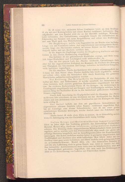 Er ift vorne vier, rückwärts fieben Centimeter breit; an dem Brufttheil ift ein mit zwei Kettengliedern und einem Knebel verfehener halbrunder Ring aufgefteckt; mit dem Knebel wird die an der Deichfel befeftigte Widerhalt kette verbunden. Der Umlaufriemen ermöglicht fonach das Zurückhalten des Fuhrwerkes bei Paraden und beim Bergabfahren, und erfetzt den Bruftriemen, und zum Theil auch den Widerhaltriemen.