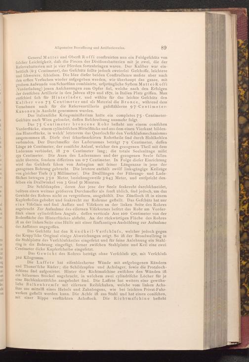 General Mattei und Oberft Roffi conftruirten nun ein Feldgefchütz von folcher Leichtigkeit, dafs die Piecen der Divifionsbatterien mit je zwei, die der Refervebatterien mit je vier Pferden fortzubringen waren. Der Kaliber war einheitlich( 6.5 Centimeter), das Gefchütz follte jedoch zweierlei Gefchoffe, leichtere und fchwerere, fchiefsen. Die Idee diefer beiden Conftructeure mufste aber nach den erften Verfuchen wieder aufgegeben werden, wie überhaupt das ganze, mit grofsem Aufwande von Scharffinn combinirte, urfprüngliche Syftem Mattei- Roffi ( Vorderladung) jenen Anfchauungen zum Opfer fiel, welche nach den Erfolgen der deutfchen Artillerie in den Jahren 1870 und 1871, in Italien Platz griffen. Man entfchied fich für Hinterlader, und wählte für das leichte Gefchütz den Kaliber von 75 Centimeter und als Material die Bronce, während dem Vernehmen nach nach für die Referveartillerie gufsftählerne 9.7- CentimeterKanonen in Ausficht genommen wurden.