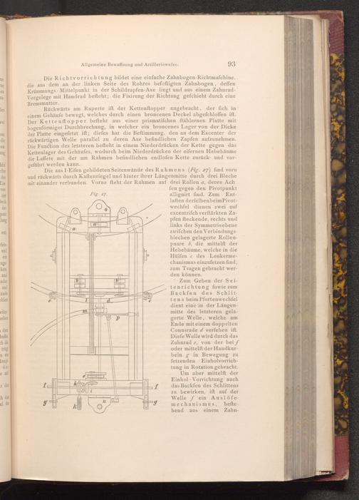 Die Richtvorrichtung bildet eine einfache Zahnbogen- Richtmaschine, die aus dem an der linken Seite des Rohres befeftigten Zahnbogen, deffen Krümmungs Mittelpunkt in der Schildzapfen- Axe liegt und aus einem ZahnradVorgelege mit Handrad befteht; die Fixirung der Richtung gefchieht durch eine