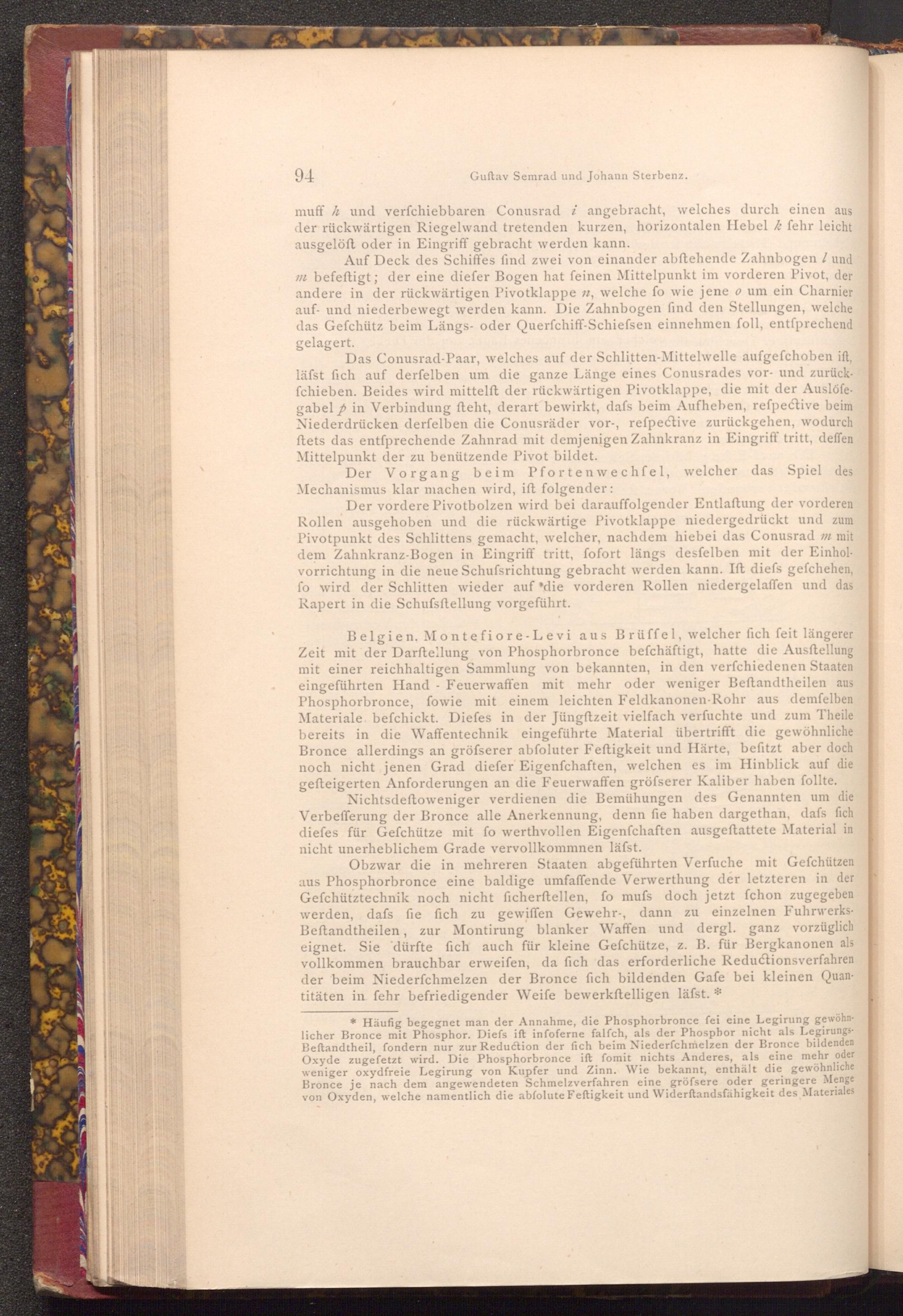 Obzwar die in mehreren Staaten abgeführten Verfuche mit Gefchützen aus Phosphorbronce eine baldige umfaffende Verwerthung der letzteren in der Gefchütztechnik noch nicht ficherftellen, fo mufs doch jetzt fchon zugegeben werden, dafs fie fich zu gewiffen Gewehr-, dann zu einzelnen FuhrwerksBeftandtheilen, zur Montirung blanker Waffen und dergl. ganz vorzüglich eignet. Sie dürfte fich auch für kleine Gefchütze, z. B. für Bergkanonen als vollkommen brauchbar erweifen, da fich das erforderliche Reductionsverfahren der beim Niederfchmelzen der Bronce fich bildenden Gafe bei kleinen Quantitäten in fehr befriedigender Weife bewerkstelligen läfst.*