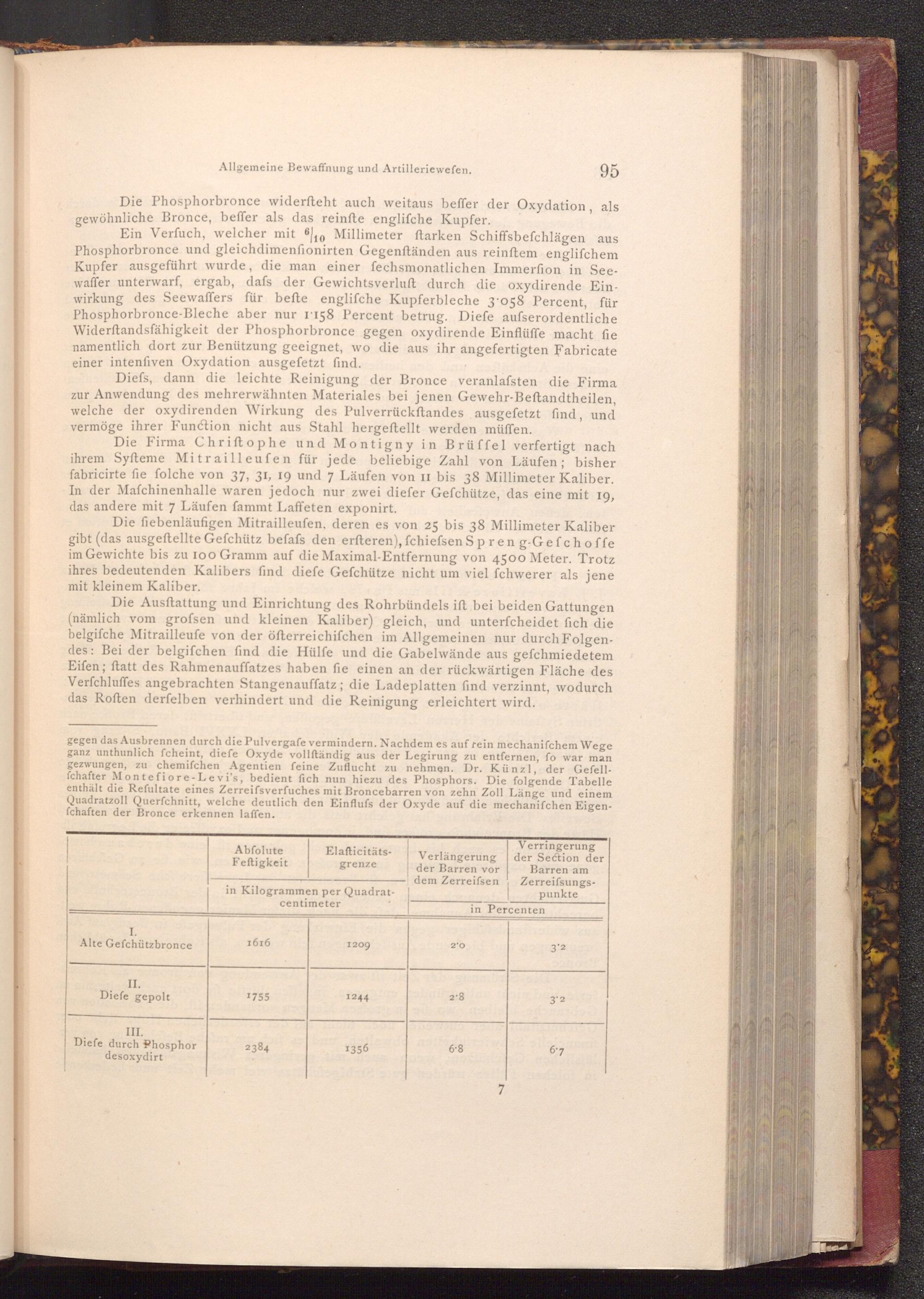 gegen das Ausbrennen durch die Pulvergafe vermindern. Nachdem es auf rein mechaniſchem Wege ganz unthunlich fcheint, diefe Oxyde vollſtändig aus der Legirung zu entfernen, fo war man gezwungen, zu chemifchen Agentien feine Zuflucht zu nehmen. Dr. Künzl, der Gefellfchafter Montefiore- Levi's, bedient fich nun hiezu des Phosphors. Die folgende Tabelle enthält die Refultate eines Zerreifsverfuches mit Broncebarren von zehn Zoll Länge und einem Quadratzoll Querfchnitt, welche deutlich den Einfluss der Oxyde auf die mechanifchen Eigenfchaften der Bronce erkennen laffen.