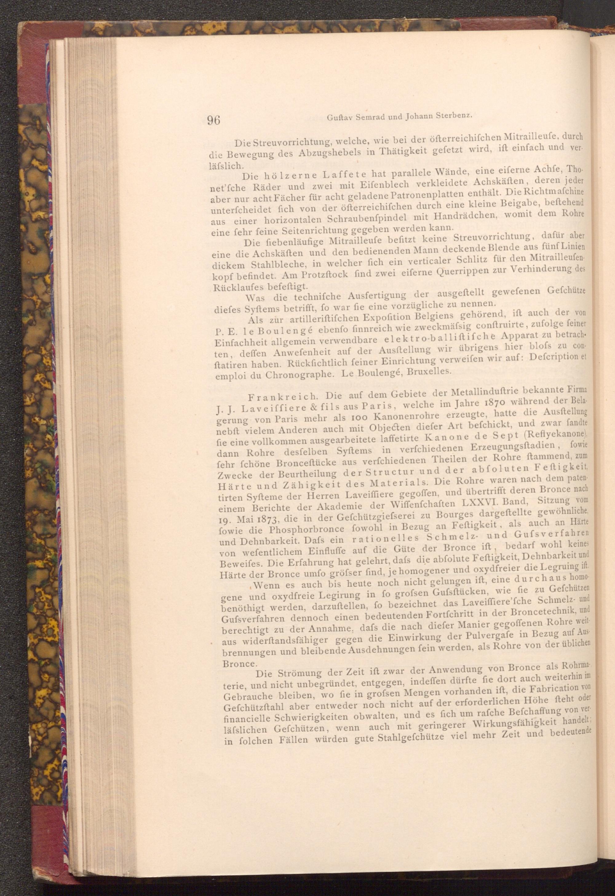 Frankreich. Die auf dem Gebiete der Metallinduftrie bekannte Firma J. J. Laveiffiere& fils aus Paris, welche im Jahre 1870 während der Belagerung von Paris mehr als 100 Kanonenrohre erzeugte, hatte die Ausstellung nebft vielem Anderen auch mit Objecten diefer Art befchickt, und zwar fandte fie eine vollkommen ausgearbeitete laffetirte Kanone de Sept( Reffyekanone), dann Rohre desfelben Syftems in verfchiedenen Erzeugungsftadien, fowie fehr fchöne Bronceftücke aus verfchiedenen Theilen der Rohre ftammend, zum Zwecke der Beurtheilung der Structur und der abfoluten Feftigkeit, Härte und Zähigkeit des Materials. Die Rohre waren nach dem patentirten Syfteme der Herren Laveiffiere gegoffen, und übertrifft deren Bronce nach einem Berichte der Akademie der Wiffenfchaften LXXVI. Band, Sitzung vom 19. Mai 1873, die in der Gefchützgiefserei zu Bourges dargestellte gewöhnliche, fowie die Phosphorbronce fowohl in Bezug an Feftigkeit, als auch an Härte und Dehnbarkeit. Dafs ein rationelles Schmelz- und Gufsverfahren von wefentlichem Einfluffe auf die Güte der Bronce ift, bedarf wohl keines Beweifes. Die Erfahrung hat gelehrt, dafs die abfolute Feftigkeit, Dehnbarkeit und Härte der Bronce umfo gröfser find, je homogener und oxydfreier die Legruing ift. Wenn es auch bis heute noch nicht gelungen ift, eine durchaus homogene und oxydfreie Legirung in fo grofsen Gufsftücken, wie fie zu Gefchützen benöthigt werden, darzuftellen, fo bezeichnet das Laveiffiere'fche Schmelz- und Gufsverfahren dennoch einen bedeutenden Fortfchritt in der Broncetechnik, und berechtigt zu der Annahme, dafs die nach diefer Manier gegoffenen Rohre weit aus widerftandsfähiger gegen die Einwirkung der Pulvergafe in Bezug auf Ausbrennungen und bleibende Ausdehnungen fein werden, als Rohre von der üblichen Bronce.
