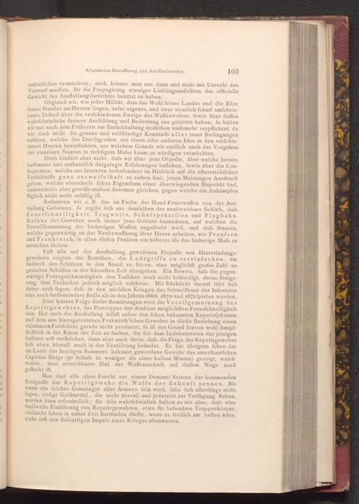 Refumiren wir z. B. das im Fache der Hand- Feuerwaffen von der Ausftellung Gebotene, fo ergibt fich aus demfelben der unabweisbare Schlufs, dafs Feuerfchnelligkeit, Tragweite, Schufspräcifion und FlugbahnRafanz der Gewehre noch immer jene Gebiete bezeichnen, auf welchen die Vervollkommnung der bisherigen Waffen angeftrebt wird, und dafs Staaten, welche gegenwärtig an der Neubewaffnung ihrer Heere arbeiten, wie Preufsen und Frankreich, in allen diefen Punkten ein höheres als das bisherige Mafs zu erreichen fuchen.