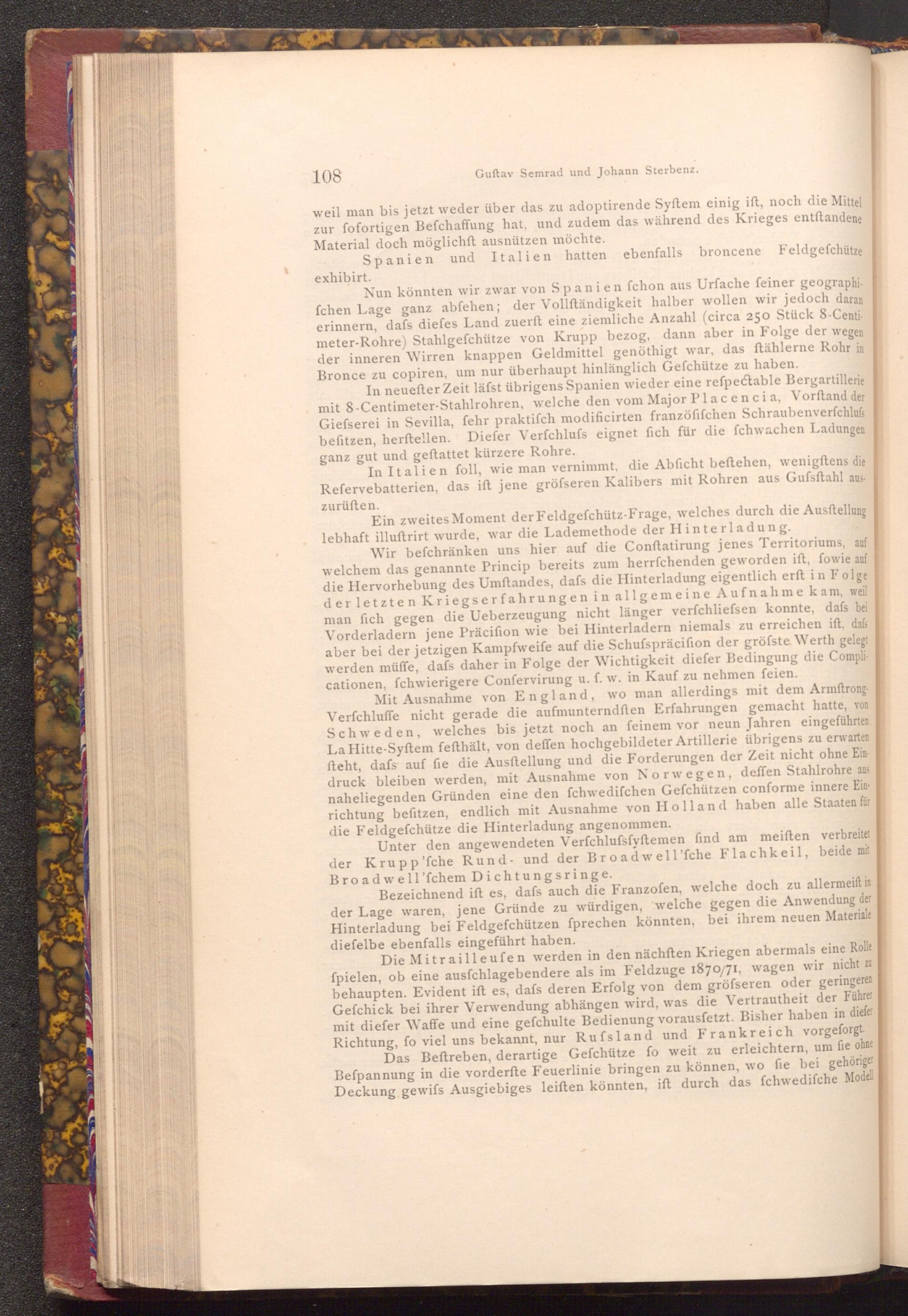 Nun könnten wir zwar von Spanien fchon aus Urfache feiner geographi fchen Lage ganz abfehen; der Vollständigkeit halber wollen wir jedoch daran erinnern, dafs diefes Land zuerft eine ziemliche Anzahl( circa 250 Stück 8- Centimeter- Rohre) Stahlgefchütze von Krupp bezog, dann aber in Folge der wegen der inneren Wirren knappen Geldmittel genöthigt war, das ftählerne Rohr in Bronce zu copiren, um nur überhaupt hinlänglich Gefchütze zu haben.