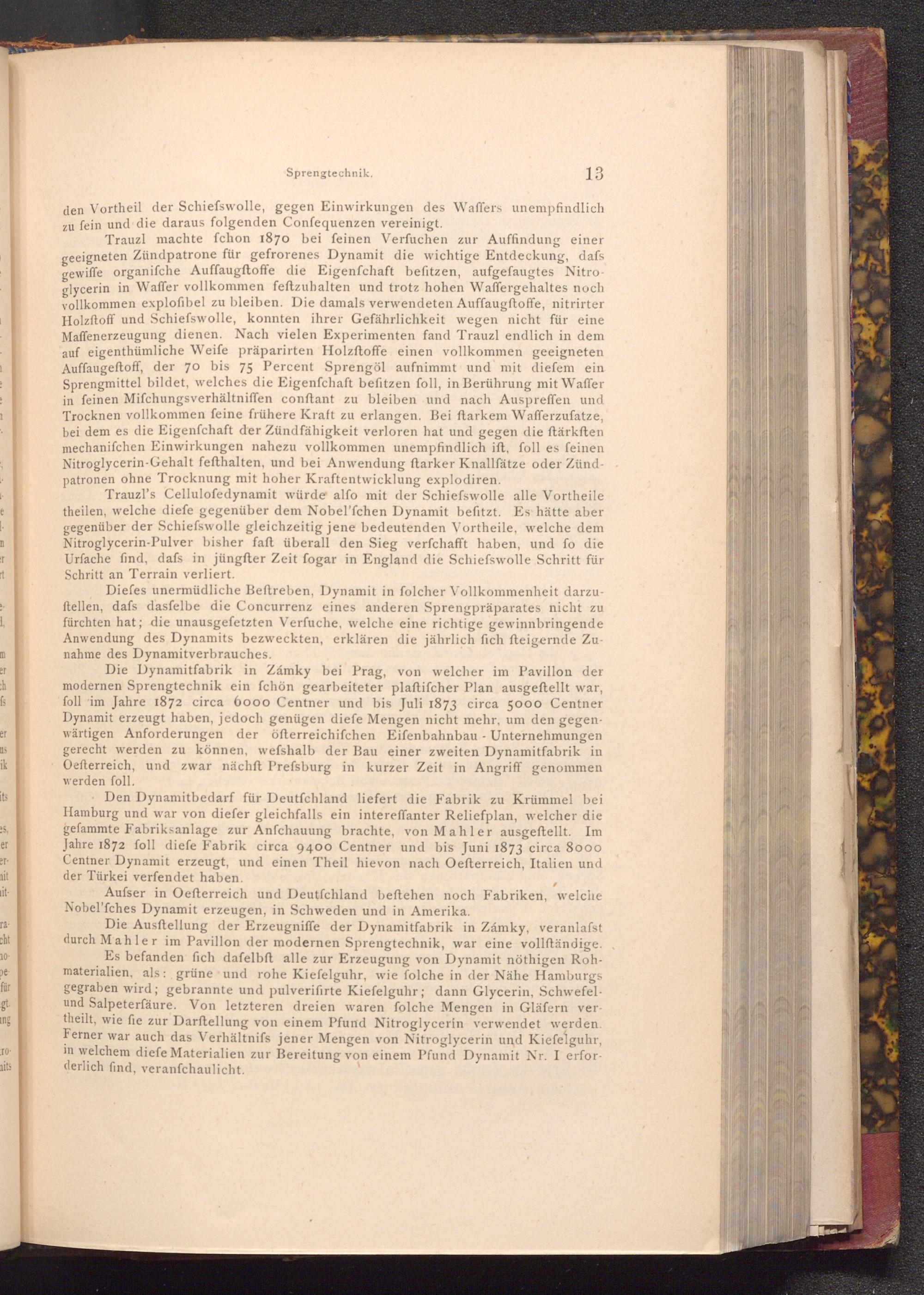 Die Dynamitfabrik in Zámky bei Prag, von welcher im Pavillon der modernen Sprengtechnik ein fchön gearbeiteter plaftifcher Plan ausgeftellt war, foll im Jahre 1872 circa 6000 Centner und bis Juli 1873 circa 5000 Centner Dynamit erzeugt haben, jedoch genügen diefe Mengen nicht mehr, um den gegenwärtigen Anforderungen der öfterreichifchen Eifenbahnbau Unternehmungen gerecht werden zu können, wefshalb der Bau einer zweiten Dynamitfabrik in Oefterreich, und zwar nächft Prefsburg in kurzer Zeit in Angriff genommen werden foll.