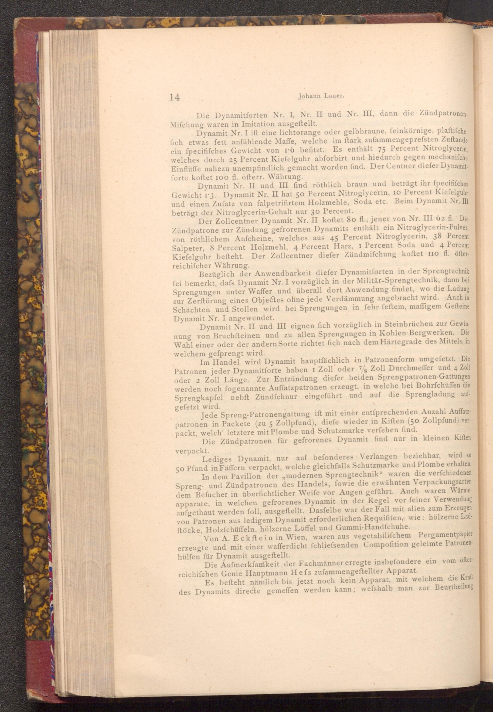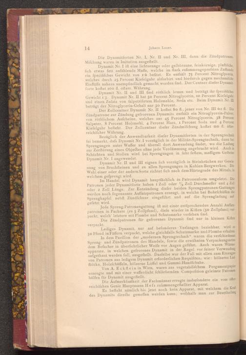 Dynamit Nr. I ift eine lichtorange oder gelbbraune, feinkörnige, plaftifche, fich etwas fett anfühlende Maffe, welche im ftark zufammengeprefsten Zuftande ein fpecififches Gewicht von 16 befitzt. Es enthält 75 Percent Nitroglycerin, welches durch 25 Percent Kiefelguhr abforbirt und hiedurch gegen mechanifche Einflüffe nahezu unempfindlich gemacht worden find. Der Centner diefer Dynamit forte koftet 100 fl. öfterr. Währung.