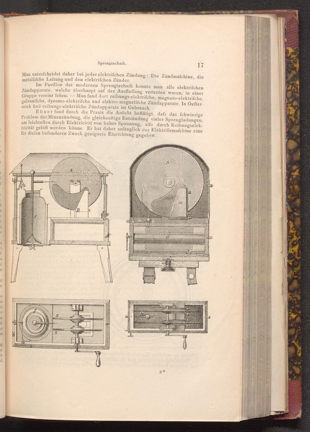 Im Pavillon der modernen Sprengtechnik konnte man alle elektriſchen Zündapparate, welche überhaupt auf der Ausftellung vertreten waren, in einer Gruppe vereint fehen. Man fand dort reibungs- elektrifche, magneto- elektriſche, galvanifche, dynamo- elektriſche und elektro- magnetifche Zündapparate. In Oefterreich find reibungs- elektriſche Zündapparate im Gebrauch.