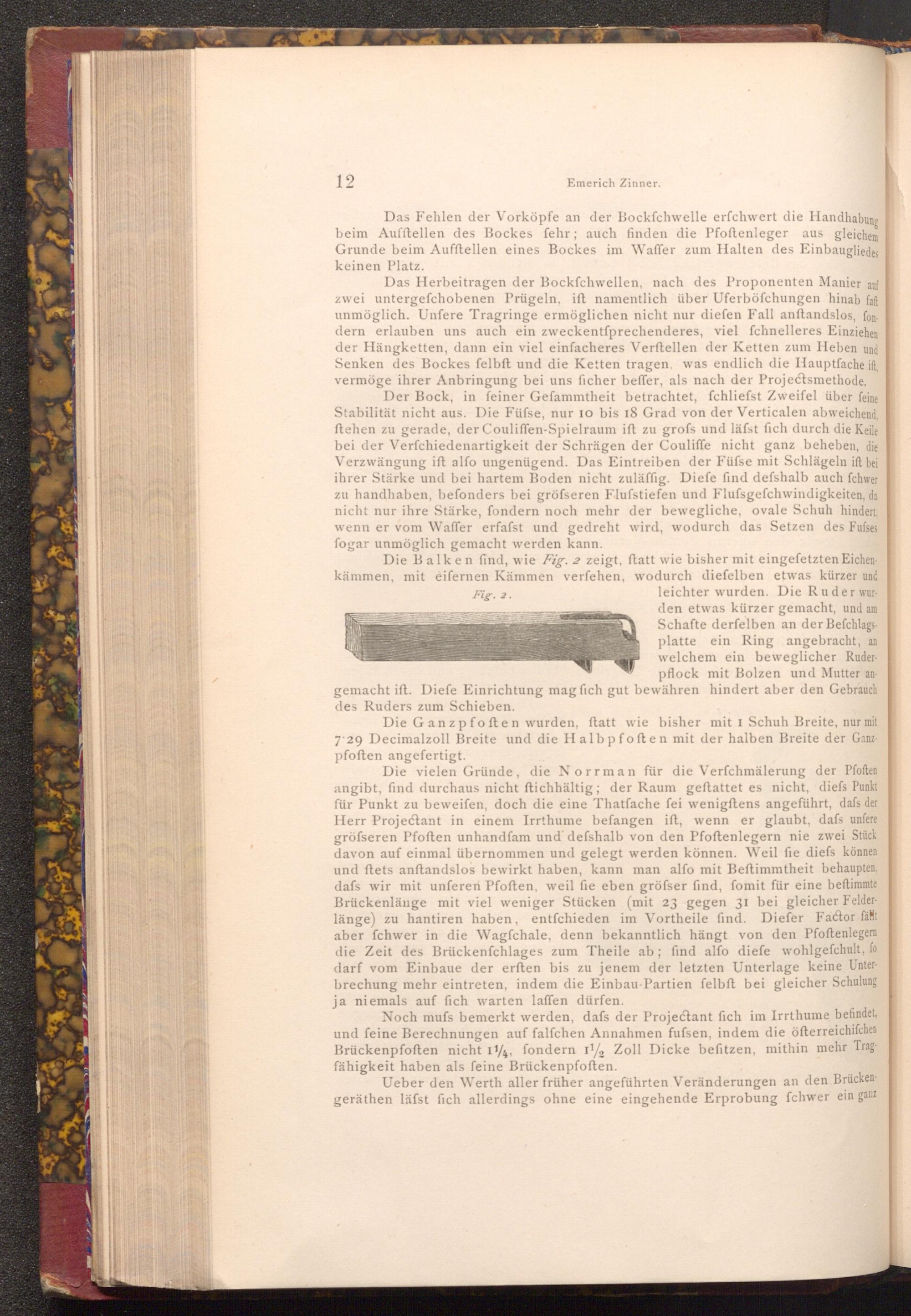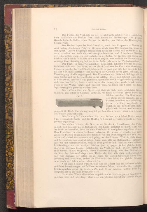 Das Herbeitragen der Bockfchwellen, nach des Proponenten Manier auf zwei untergefchobenen Prügeln, ift namentlich über Uferböfchungen hinab faft unmöglich. Unfere Tragringe ermöglichen nicht nur diefen Fall anftandslos, fon dern erlauben uns auch ein zweckentfprechenderes, viel ſchnelleres Einziehen der Hängketten, dann ein viel einfacheres Verftellen der Ketten zum Heben und Senken des Bockes felbft und die Ketten tragen, was endlich die Hauptfache ift, vermöge ihrer Anbringung bei uns ficher beffer, als nach der Projectsmethode. Der Bock, in feiner Gefammtheit betrachtet, fchliefst Zweifel über feine Stabilität nicht aus. Die Füfse, nur 10 bis 18 Grad von der Verticalen abweichend, ftehen zu gerade, der Couliffen- Spielraum ift zu grofs und läfst fich durch die Keile bei der Verfchiedenartigkeit der Schrägen der Couliffe nicht ganz beheben, die Verzwängung ift alfo ungenügend. Das Eintreiben der Füsse mit Schlägeln ift bei ihrer Stärke und bei hartem Boden nicht zuläffig. Diefe find defshalb auch schwer zu handhaben, befonders bei gröfseren Flufstiefen und Flufsgefchwindigkeiten, da nicht nur ihre Stärke, fondern noch mehr der bewegliche, ovale Schuh hindert. wenn er vom Waffer erfafst und gedreht wird, wodurch das Setzen des Fufses fogar unmöglich gemacht werden kann.