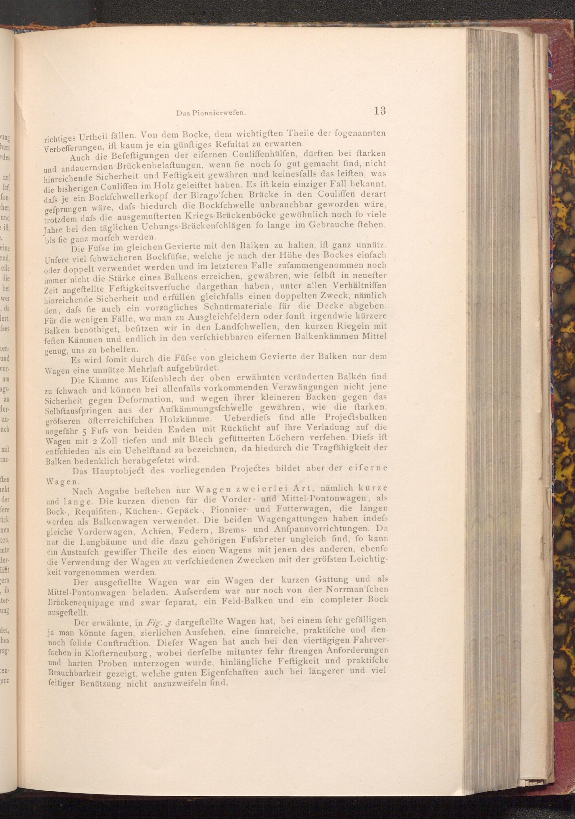 Nach Angabe beftehen nur Wagen zweierlei Art, nämlich kurze und lange. Die kurzen dienen für die Vorder- und Mittel- Pontonwagen, als Bock, Requifiten-, Küchen. Gepäck-, Pionnier- und Futterwagen, die langen werden als Balkenwagen verwendet. Die beiden Wagengattungen haben indefs gleiche Vorderwagen, Achfen, Federn, Brems- und Anfpannvorrichtungen. Da nur die Langbäume und die dazu gehörigen Fufsbreter ungleich find, fo kann ein Austausch gewiffer Theile des einen Wagens mit jenen des anderen, ebenfo die Verwendung der Wagen zu verfchiedenen Zwecken mit der gröfsten Leichtigkeit vorgenommen werden.