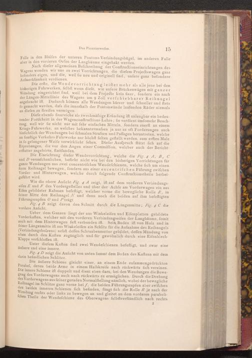 Die erfte, die Wendevorrichtung leiftet mehr als alle jene bei den bisherigen Fuhrwerken, felbft wenn diefe, wie unfere Brückenwägen mit ganzer Wendung eingerichtet find, weil bei dem Projecte kein fixer, fondern ein nach der Längen- Mittellinie des Wagens um 9 Zoll verfchiebbarer Reihnagel angebracht ift. Dadurch können alle Wendungen kürzer und fchneller und ftets fo gemacht werden, dafs die innerhalb der Pontonwände laufenden Räder niemals an diefen zu ftreifen vermögen.