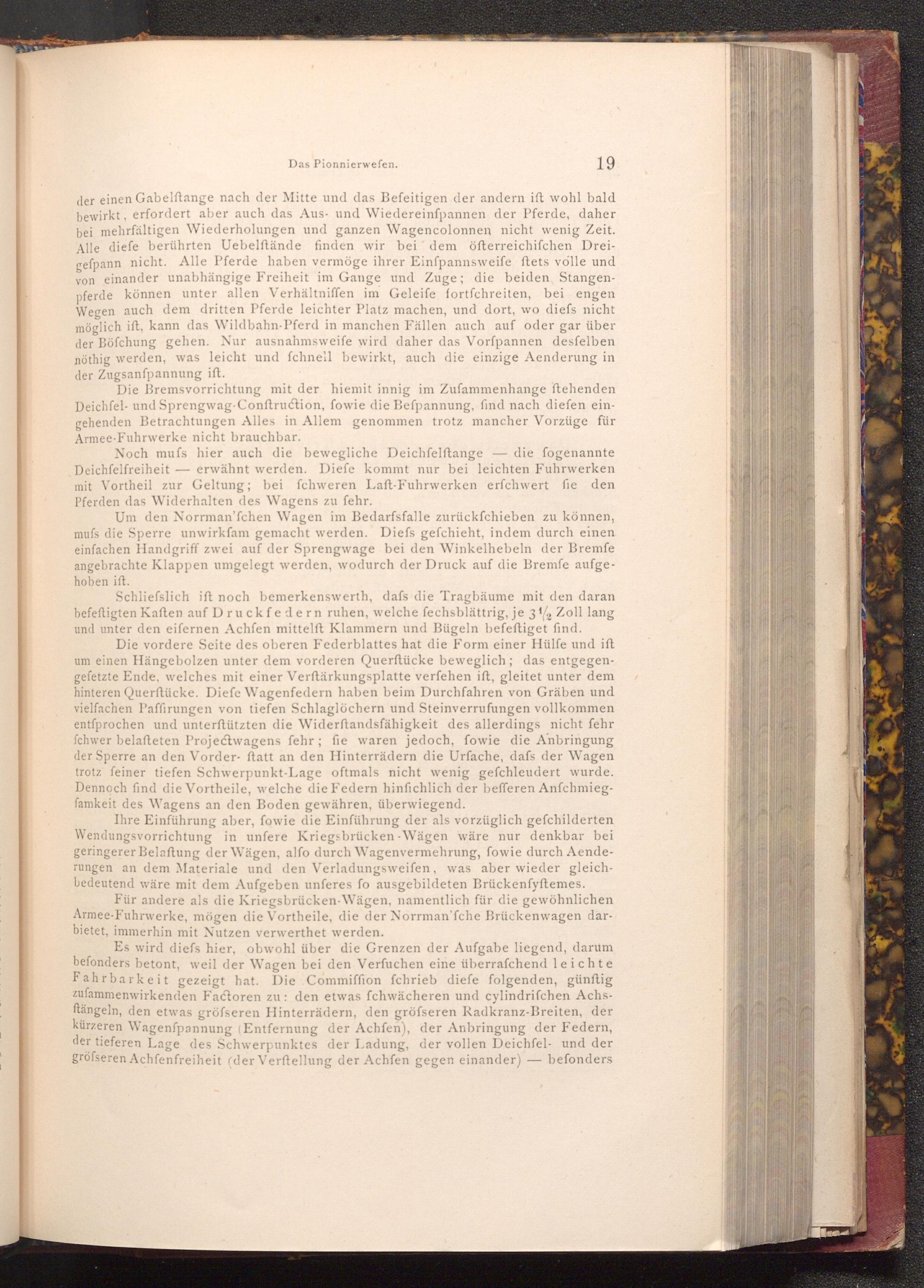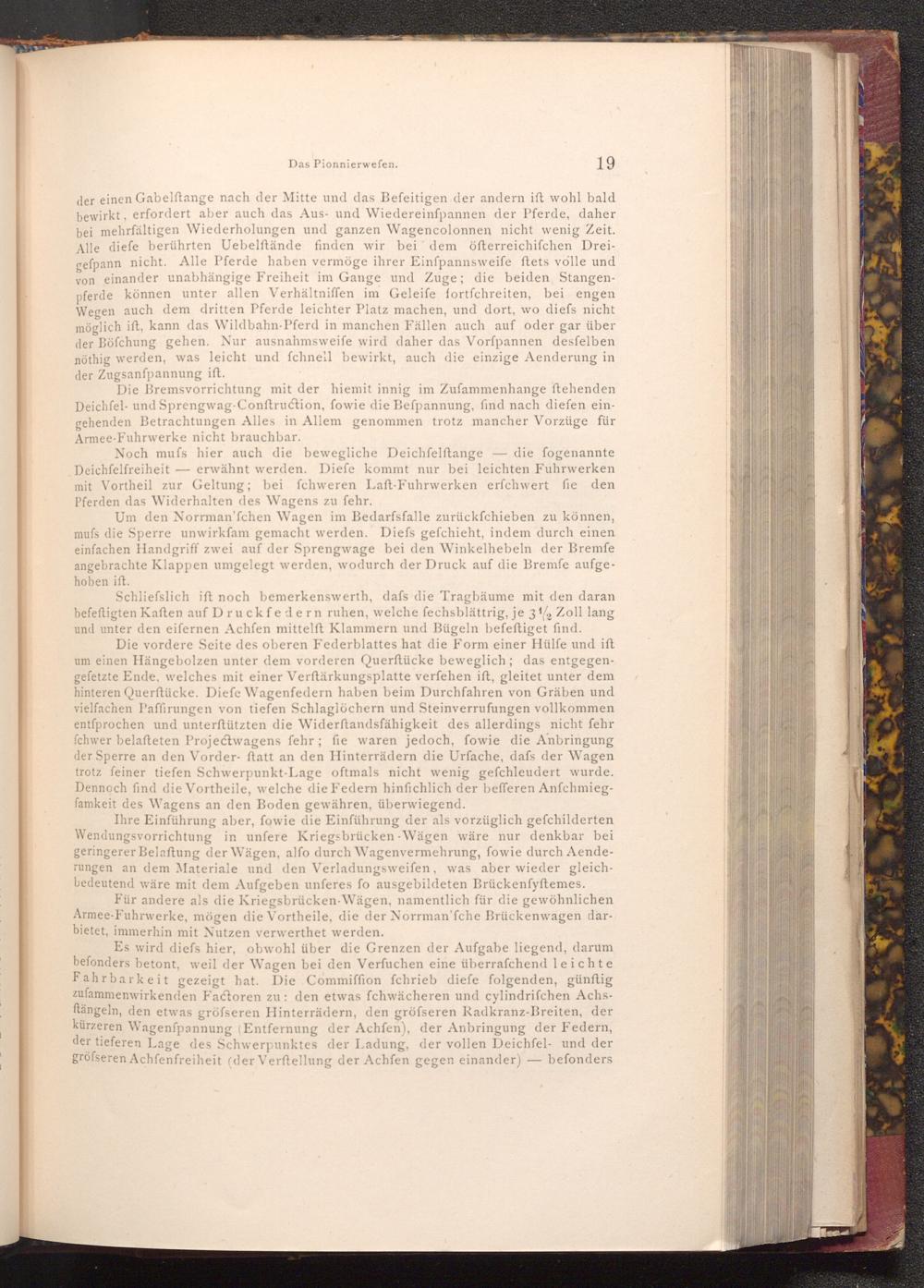 Die Bremsvorrichtung mit der hiemit innig im Zufammenhange ftehenden Deichfel- und Sprengwag- Conftruction, fowie die Befpannung, find nach diefen eingehenden Betrachtungen Alles in Allem genommen trotz mancher Vorzüge für Armee- Fuhrwerke nicht brauchbar.